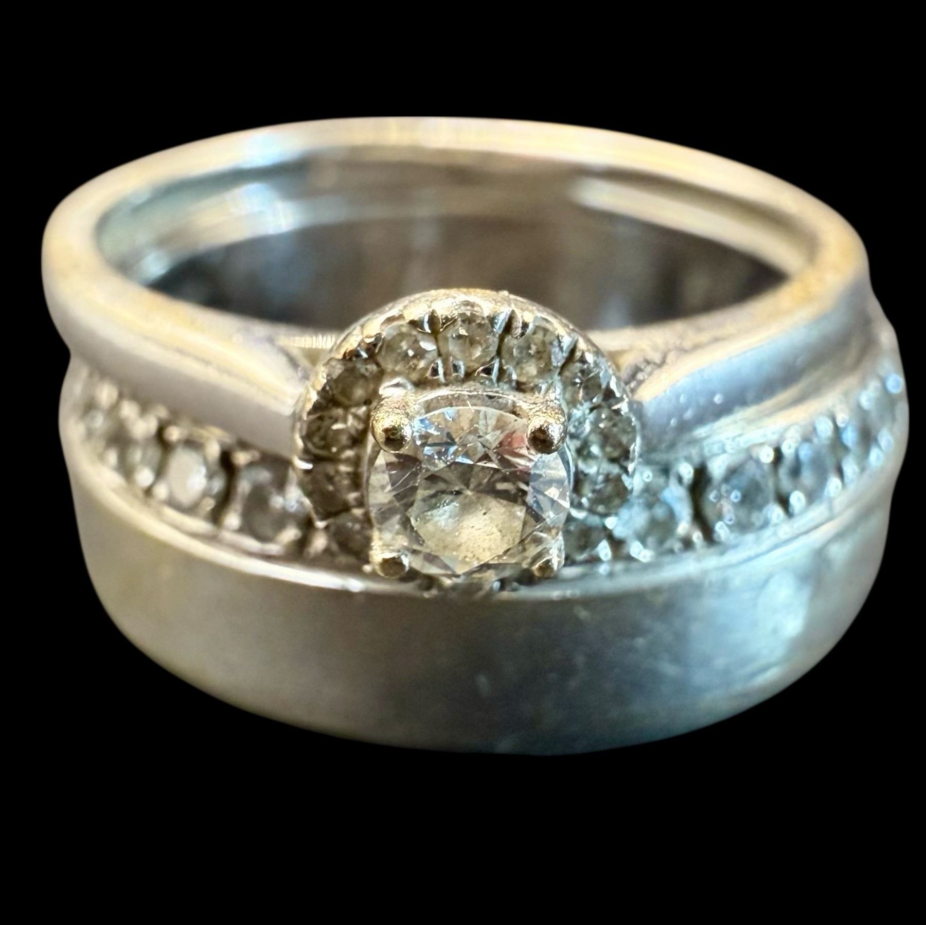 This is an 18 karat white gold set of rings. The first of which features an approximate .15 carat round, brilliant-cut, G color SI3 clarity diamonds that has a sparkling diamond halo. The ring is approximately 2.5mm wide and has a slight cathedral profile and a polished finish. It is US size 4.5. The wide band has a complete circle of round, brilliant-cut, G color, SI3 clarity diamonds, is approximately 6.5mm wide and is US size 5 with a polished finish. The set has a total of .50 carats diamonds and is NOT soldered together. See below for sizing options, details on existing inscription, and other important information. Admin: CKP2/5.1-brrr