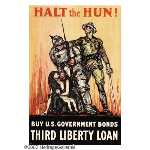 <B>Halt the Hun</B></I> (Lot of 3) 30" x 20" Artist: Raleigh. This poster was issued for the Third Liberty Loan, the Third Liberty Loan posters seem to be ripe with violent and vehement images. This one is no exception; it depicts an American soldier grabbing hold of a Hun who has grasped onto a screaming woman. Very few posters feature direct interaction between the enemy and America. Do not miss your chance to own this fabulous and firey image! <BR><BR>Condition: <BR>Poster 1-Fair; severe tear on top edge which extends into graphic, major tear on bottom edge with a large piece missing, rubbing of the ink has occurred in upper and lower quadrants, tape on the front and verso need immediate removal. <BR>Poster 2-Fine; small/minor tears on edges, dirt residue on bottom edge, lower right corner slightly torn. <BR>Poster 3-Good; two major tears on right edge, hard crease on x-axis in upper and lower quadrants, dirt residue on top edge.
