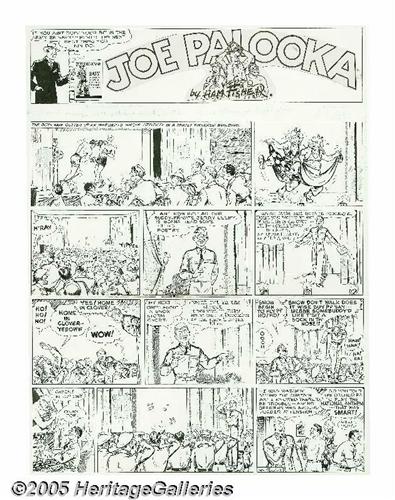 <B>Ham Fisher Studio - Joe Palooka Sunday Comic Strip Original Art, dated 3-22-42 (McNaught Syndicate, 1942).</B></I> Joe Palooka bails his pal Jerry Leemy out of a tough act in this wartime Sunday. The strip was cut between panel tiers three and four and the pieces have since been rejoined. The overall image area measures 16.5" x 22". The title logo and the lower portion of panel tier three show some aging; otherwise the art is in Very Good condition.