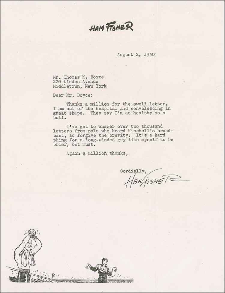 Cartoonist (1900–1955) best known as the creator of the durable strip Joe Palooka. TLS, one page, 8.5 x 11, Joe Palooka letterhead, August 2, 1950. Letter of thanks while recovering from an illness. In part: “I am out of the hospital and convalescing in great shape. They say I’m as healthy as a bull. I’ve got to answer over two thousand letters from pals who heard Winchell’s broadcast, so forgive the brevity.” Accompanied by the original mailing envelope. In fine condition, with intersecting mailing folds, one through a single letter of signature, and a few corner creases. RRAuction COA.