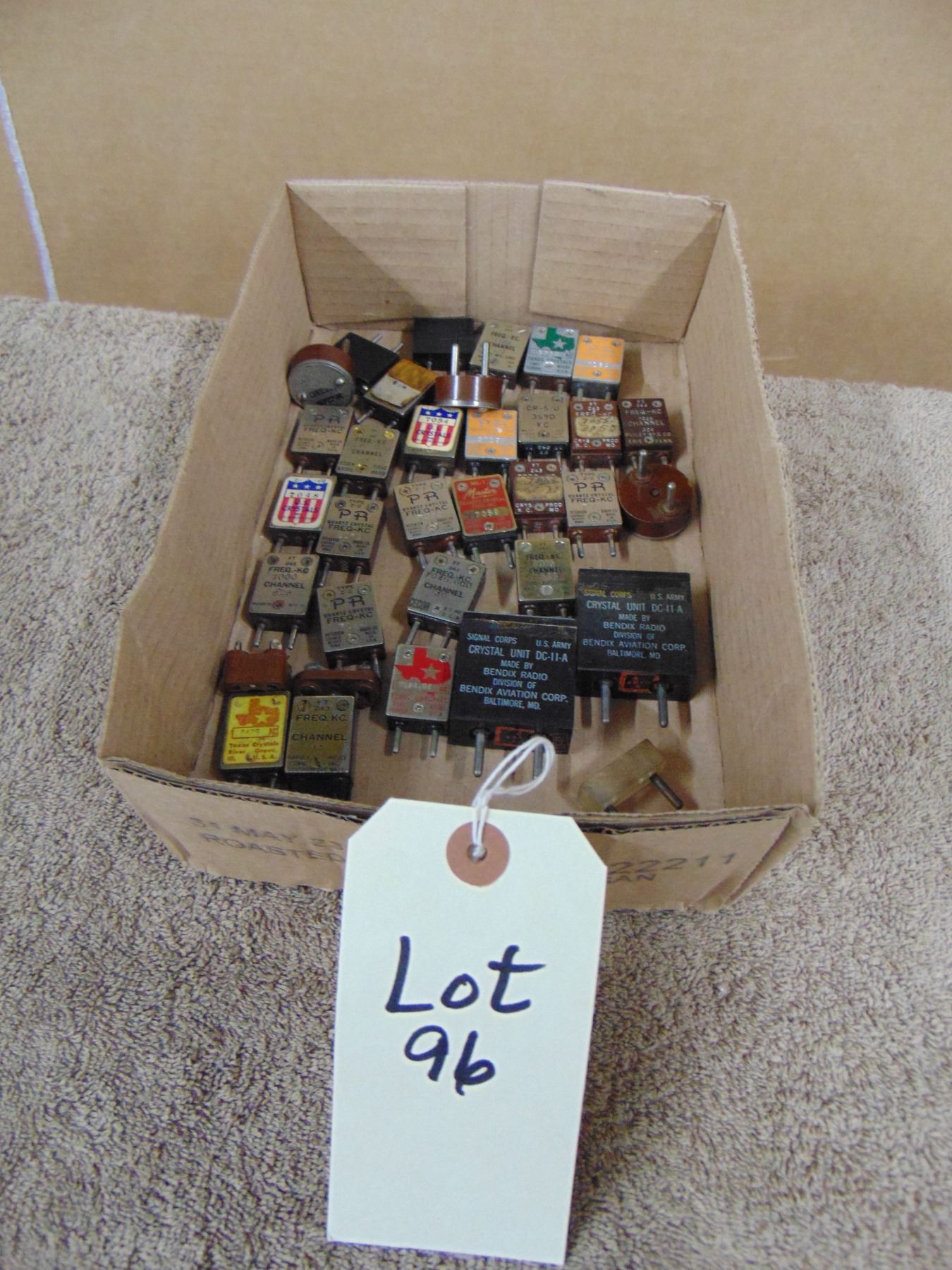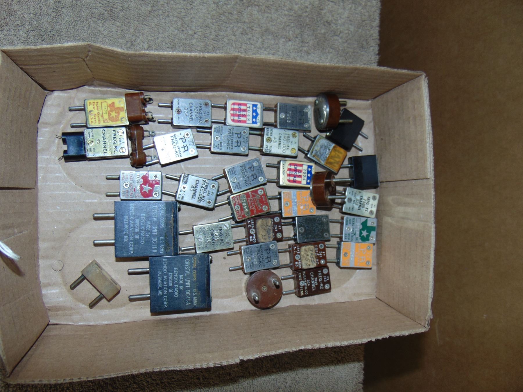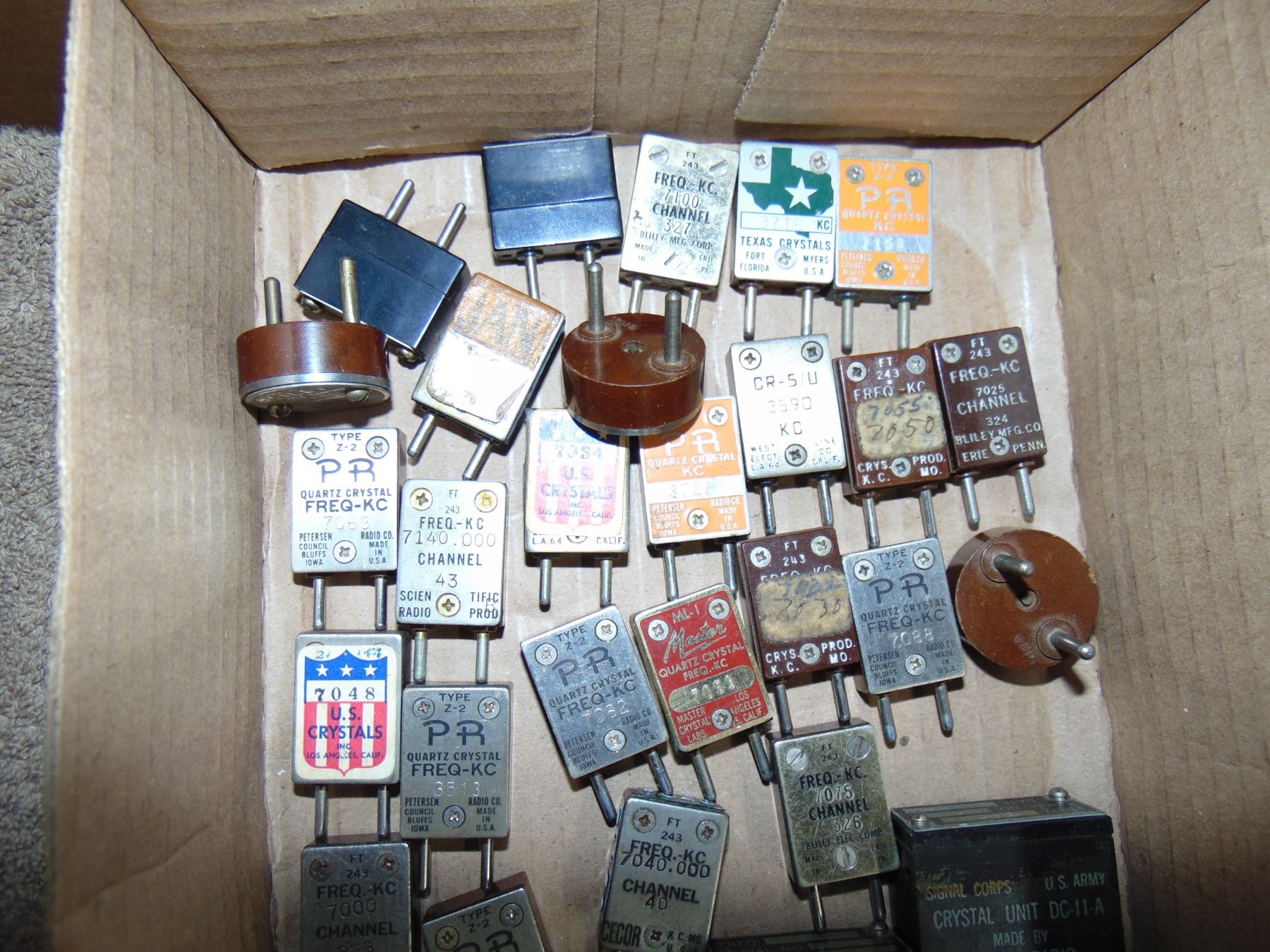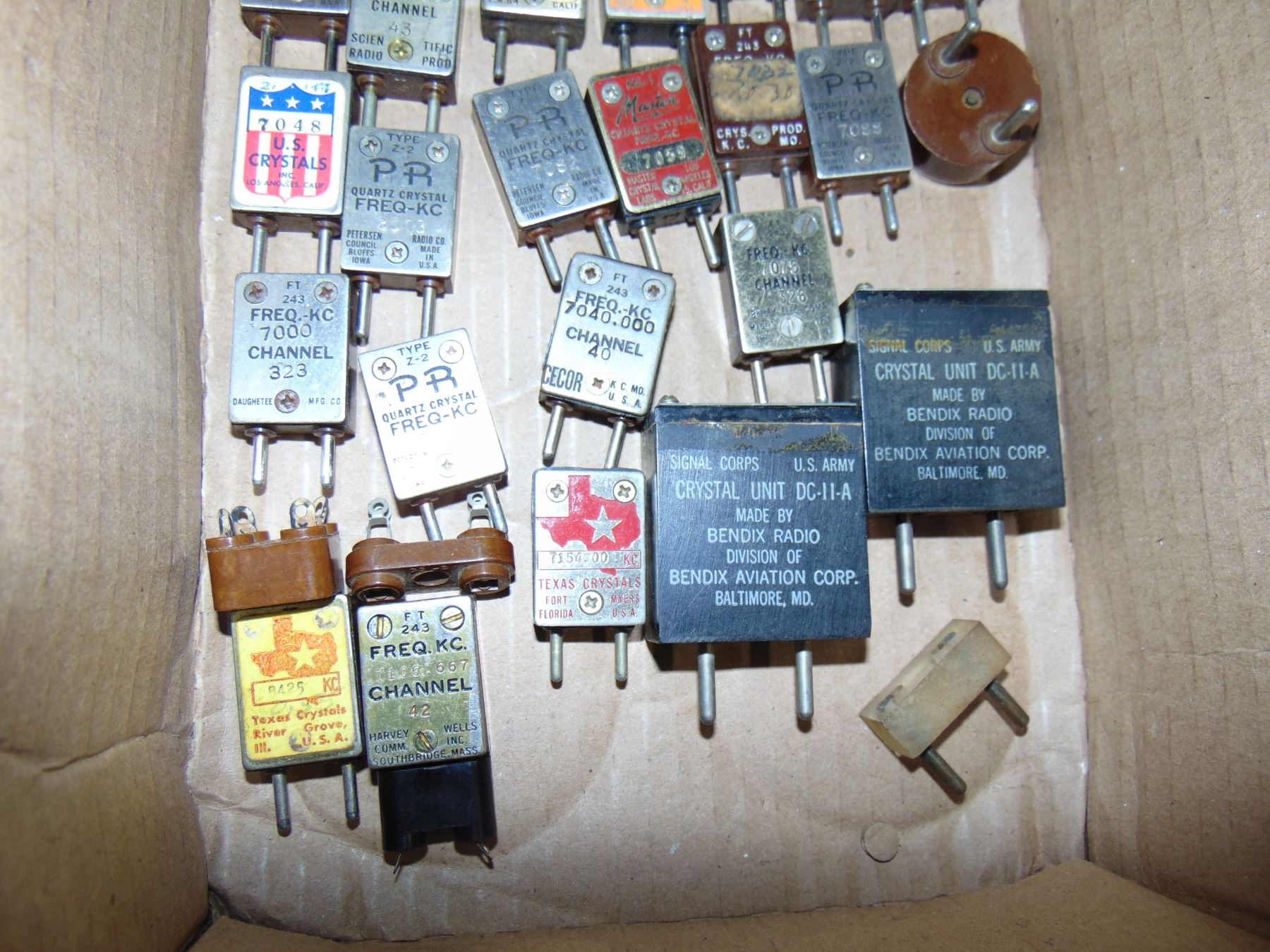 Flat of transmitter crystals; many in the 40 meter ham radio band; mostly type FT 243