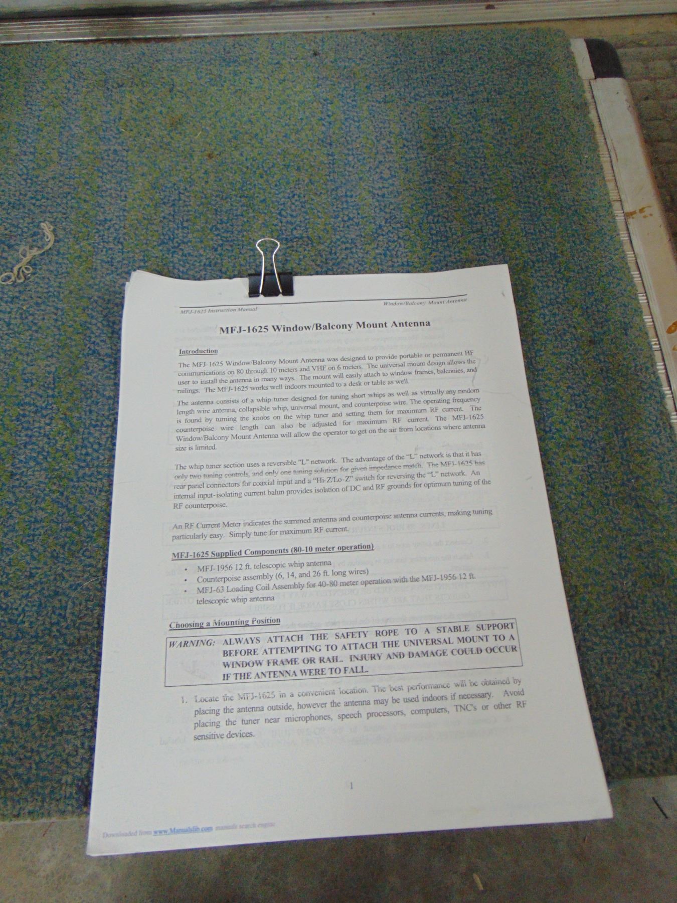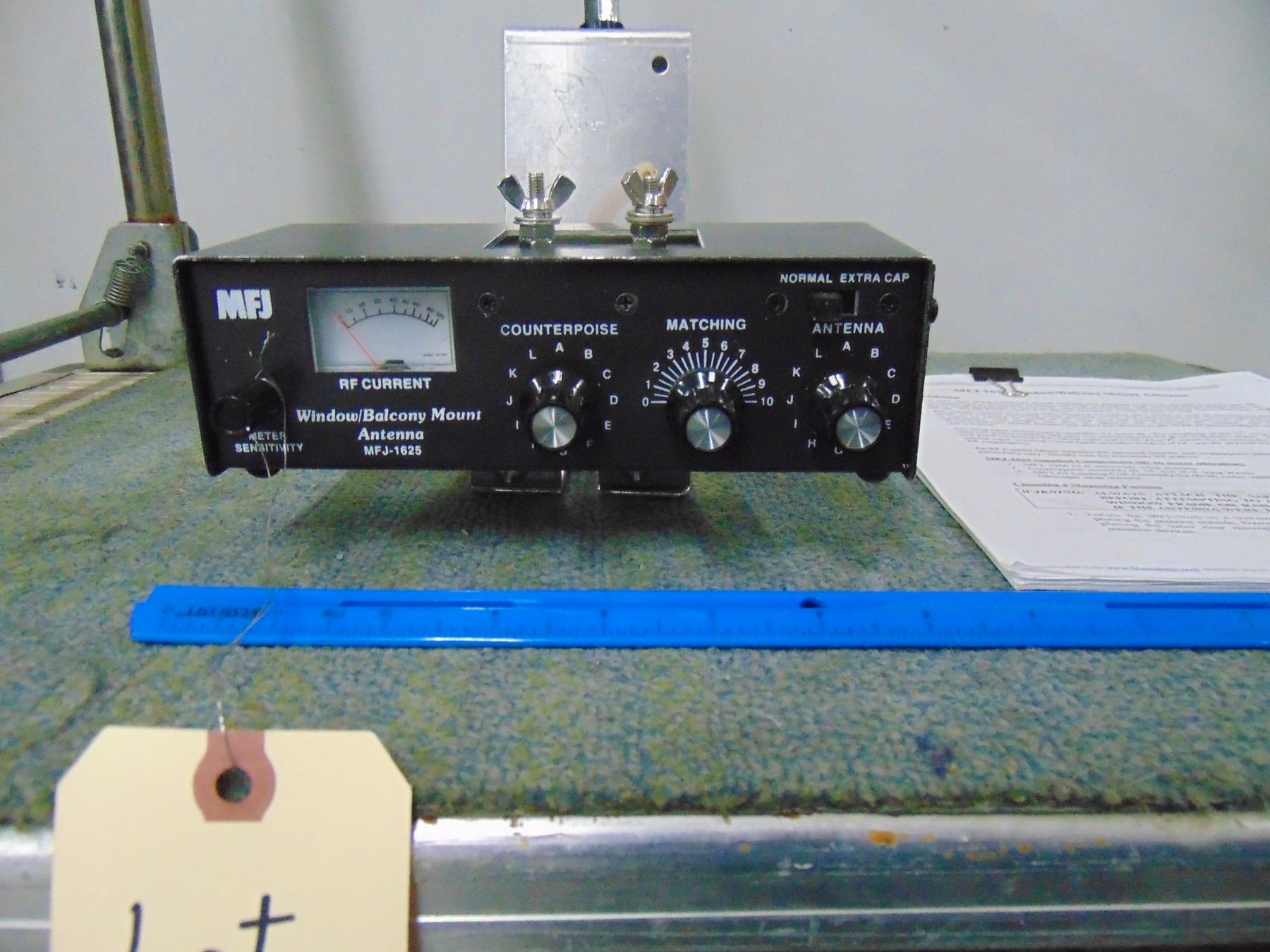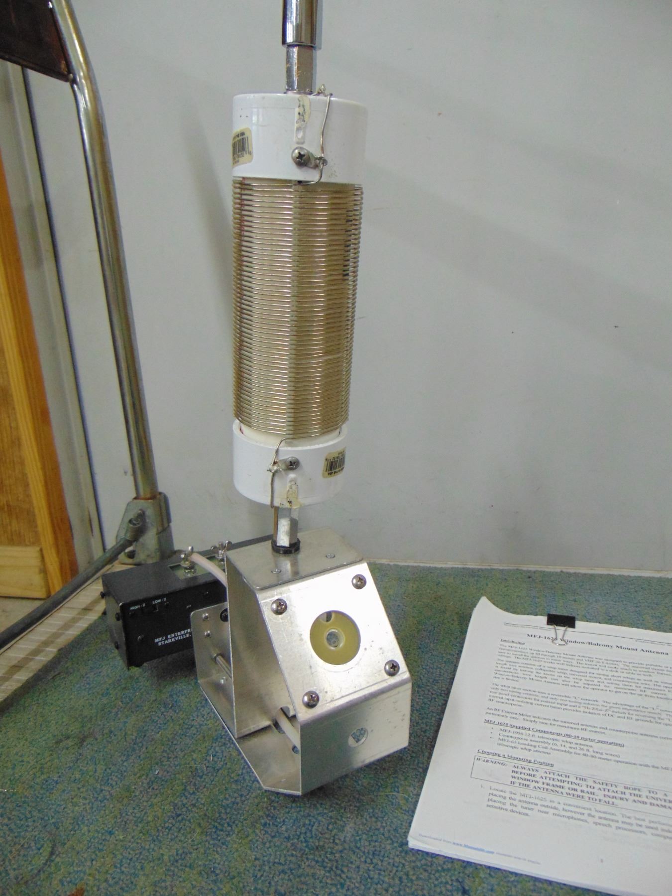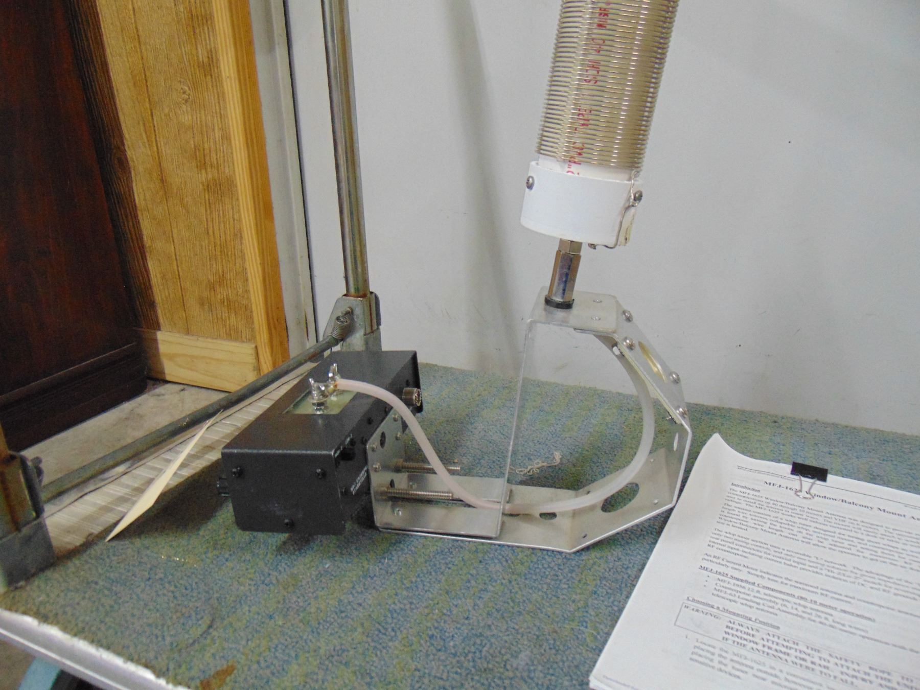 MFJ window/balcony antenna mount; model MFJ-1625; includes 12 ft. telescopic whip antenna and loading coil; works 80-10 meter operation