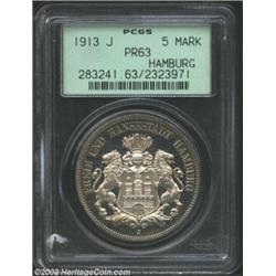 Hamburg. 5 Marks 1913J, KM293, PR63 PCGS. A beautiful example of this rare proof striking. Important