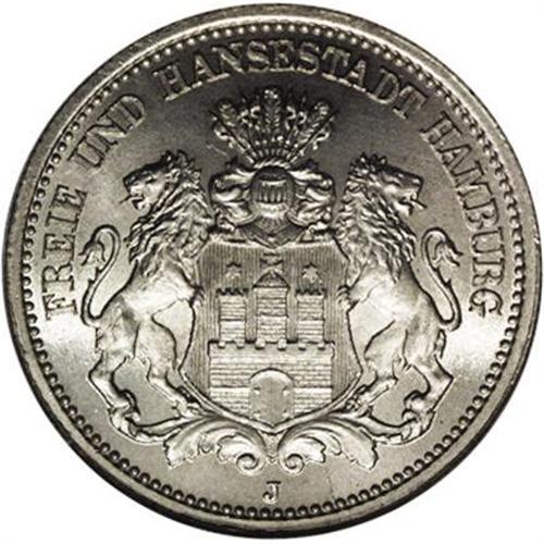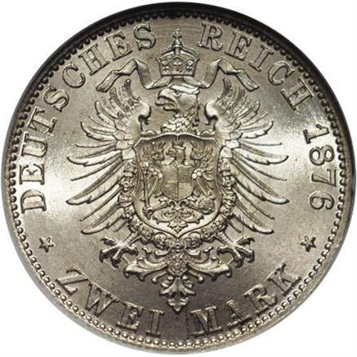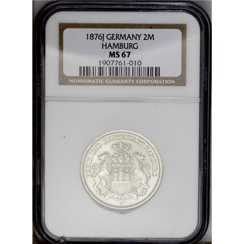 <B>Hamburg. Free City 2 Mark 1876J, </B></I>KM290, MS67 NGC. A frosty, virtually perfect example of this early issue.