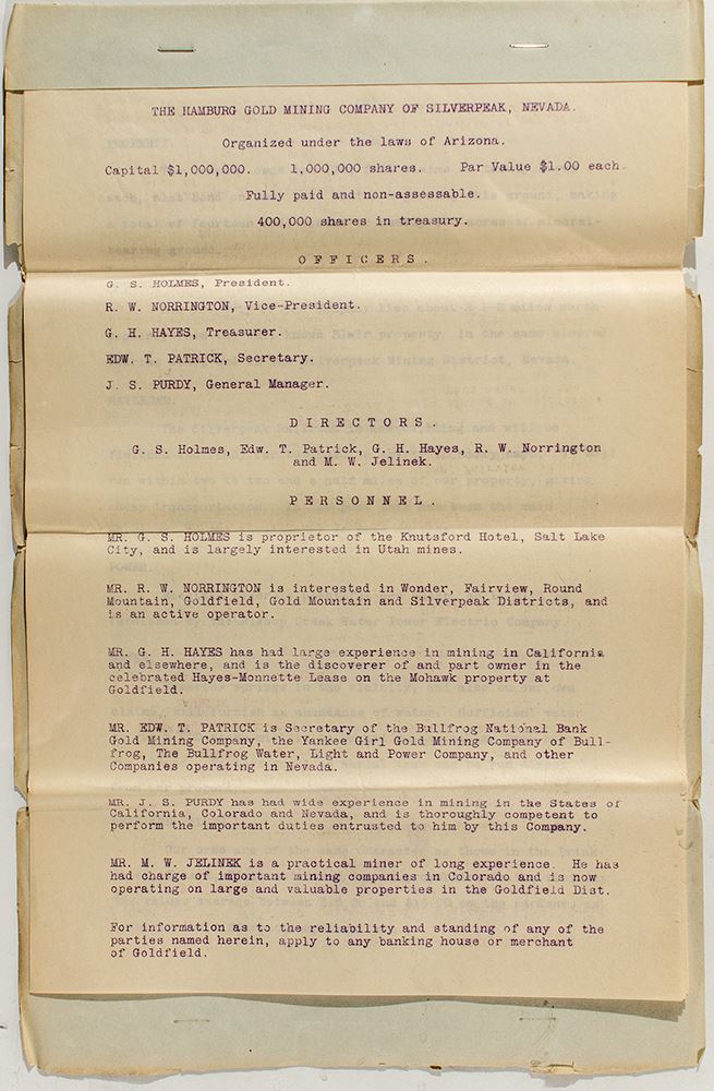 Inc. in Arizona. Mines in Red Mountain Mining District. Esmeralda County. Seven page prospectus includes assay results, detailed description of geology, and ends with a map of the mining claims. Mentions that the Silverpeak Railroad will be completed in 30-60 days. Folded with soft covers.