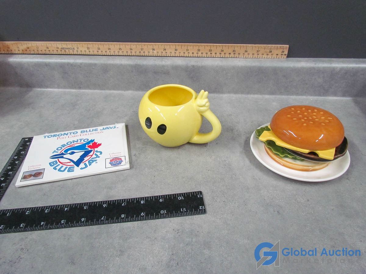 Hamburger Coaster Set, Happy Face Mug & 1994 Toronto Blue Jays Post Card Collection (Unopened)