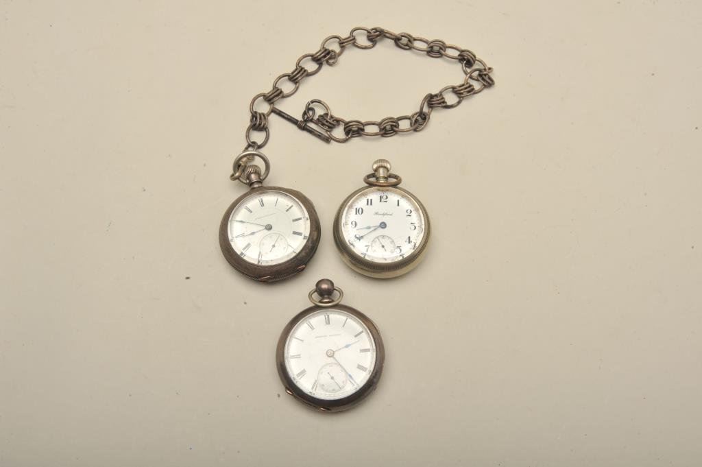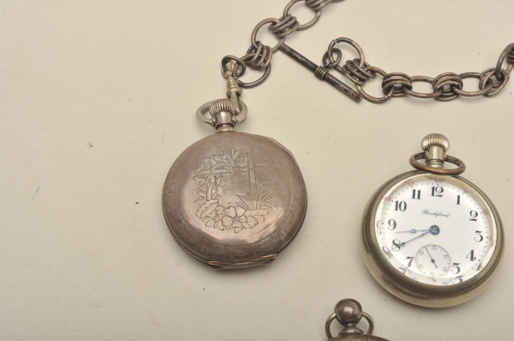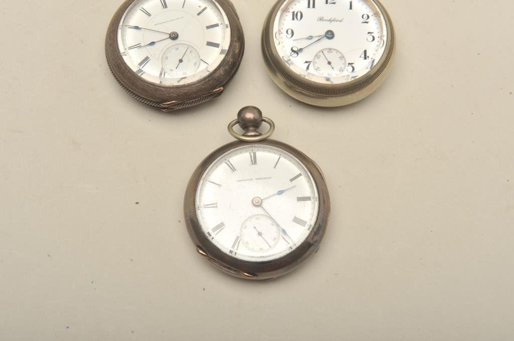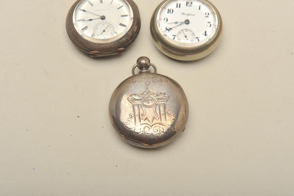 Coin silver case, second hand, some dents to back along with Rockford open face not running, American Watch Co. open face, silver case, running. Lot of 3. Est:$150-300