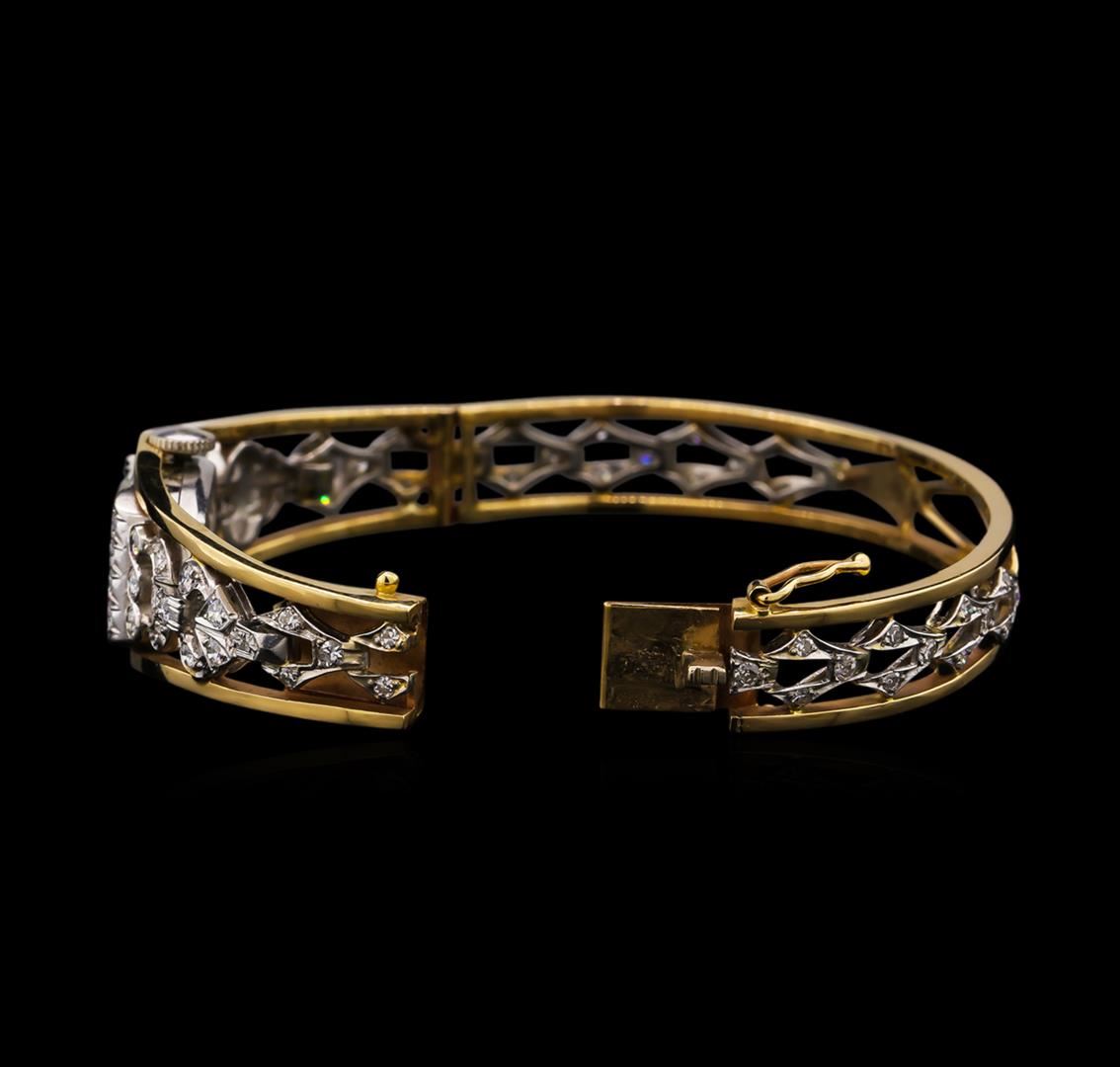 One electronically tested 14KT & platinum yellow gold lady's combination cast & assembled bangle bracelet Hamilton watch with a tongue clasp with foldover safety with a bright polish finish. The featured lady's bangle bracelet watch has a 17 jewel manual wind movement, movement number T47 3084 and case number 832697. The featured watch has a gold tone dial with silver narrow, baton-type hands. The featured bangle bracelet measures 6.5 inches in circumference. Condition is used, good workmanship. Containing: Forty prong set round brilliant cut diamonds, measuring 2.40 - 2.00 x 1.36mm (depth est.) approximate total weight of 40 Stones = 1.60ct. Graded in the setting. Clarity: VS-2 to SI-2. Color: G - Very Good Thirty-Six prong set single cut diamonds, measuring 2.00 - 1.90 x 1.21mm (depth est.) approximate total weight of 36 Stones = 1.00ct. Graded in the setting. Clarity: VS-2 to SI-1. Color: G - I. Cut Good. Total Weight of Diamonds 2.60ct. Total Weight of Bracelet Hamilton Watch 28.60gm. GAS Appraised at $7,210.00.