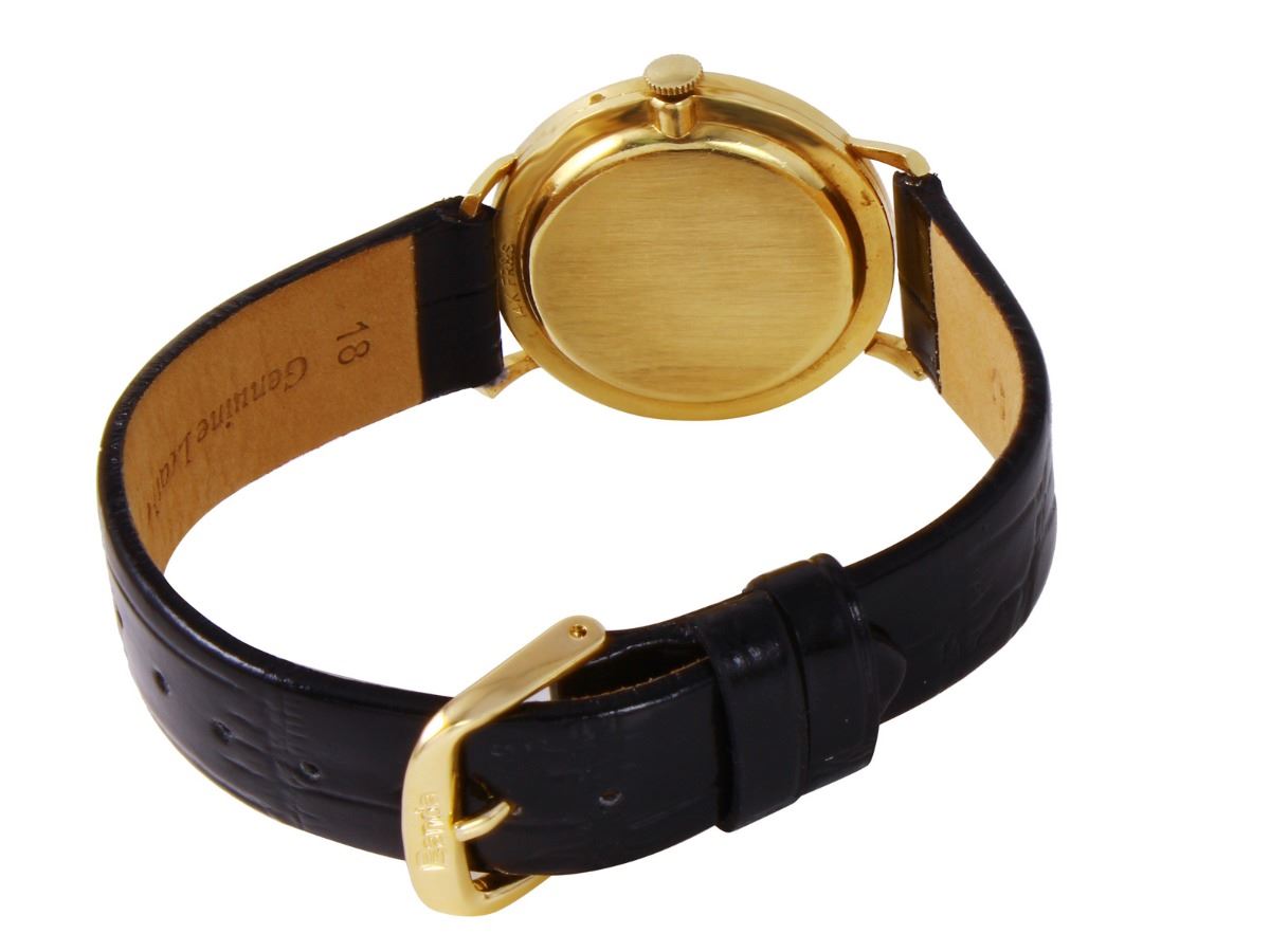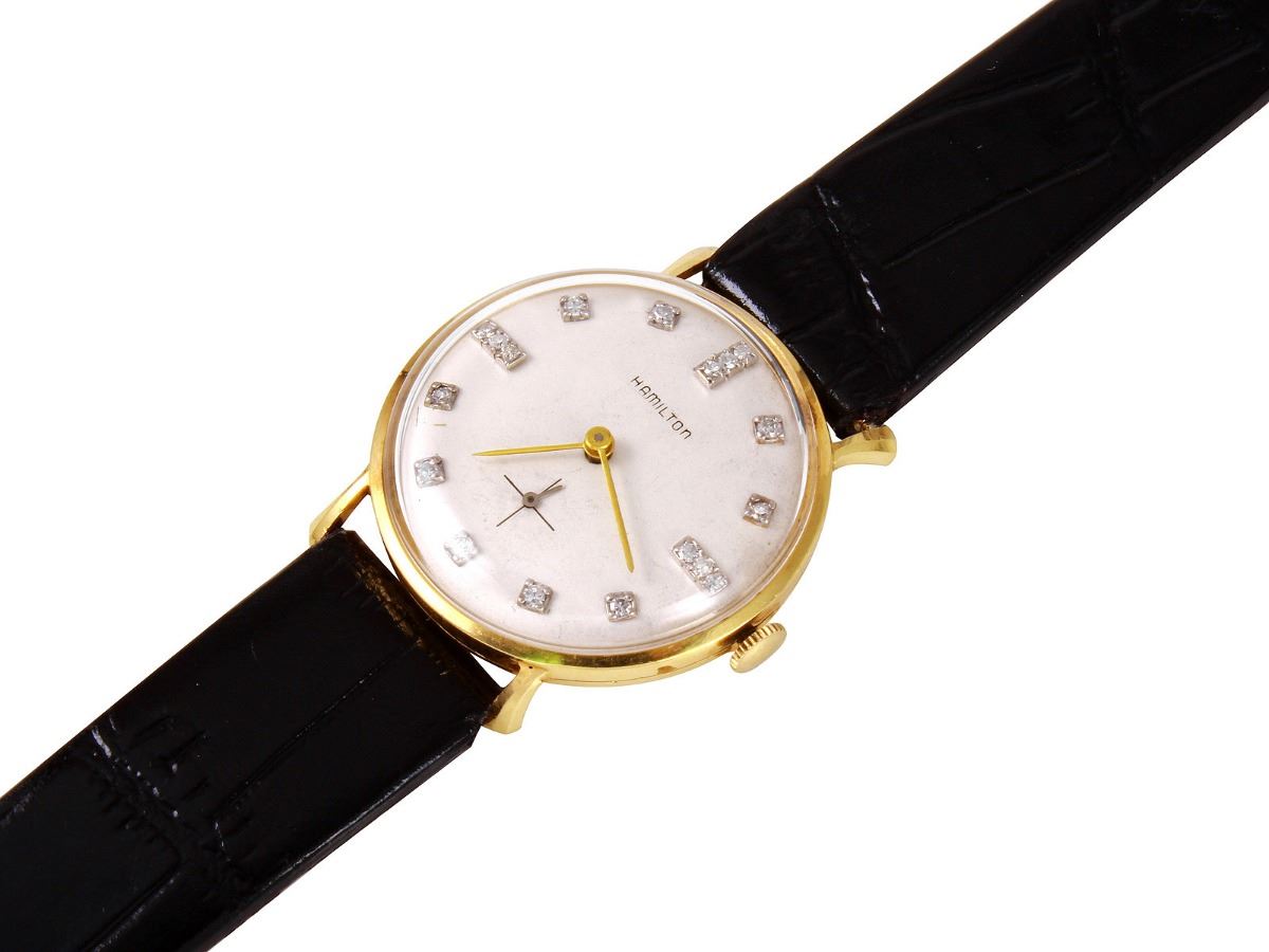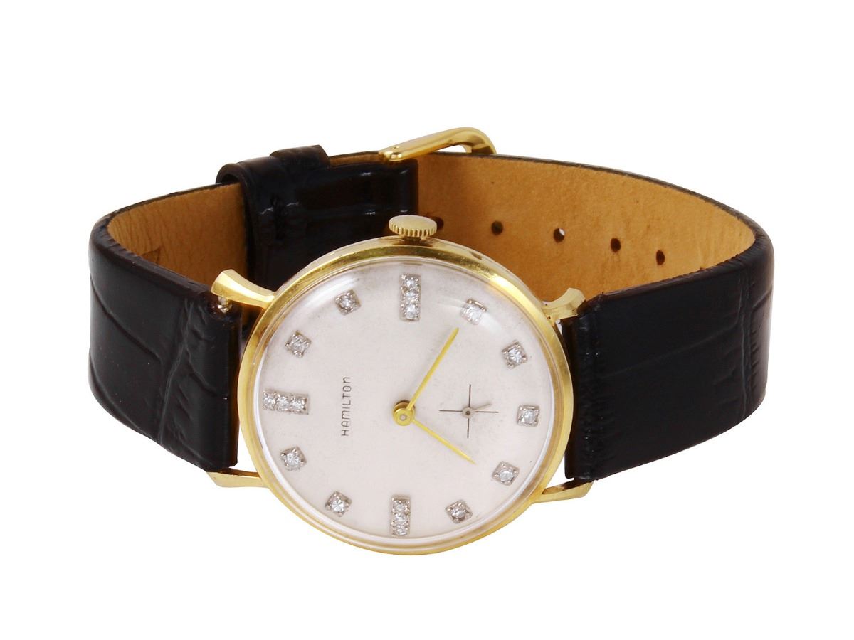 Hamilton 14KT Yellow Gold Mechanical WatchCase: 14KT yellow gold, 32mm in diameter, signed on the back " 14K FR & S ". Dial: Silvered, diamond markers and yellow gold hands, small seconds at 6. Movement: Mechanical, manual wind, 22 jewels. Strap: Black, genuine leather, aftermarket 8.5" in length. Condition: Movement is very good and running. Case is very good, dial is good and strap is very good. Gross Weight: 28.23 grams Containing: Eighteen prong set single cut diamonds, measuring 1.40 - 1.40 x 0.84mm (depth est.) approximate total weight of 18 Stones = 0.18ct. Clarity of VS-2, Color of G, Cut is Very Good. Approximate Total Weight of Diamonds 0.18ct. Total Weight of 28.23gm. The descriptions listed should not be construed as an appraisal. The detail is provided as a guideline for color, clarity, weights and measurements to the best of our ability. We welcome inspections. WE SHIP WORLDWIDE!
