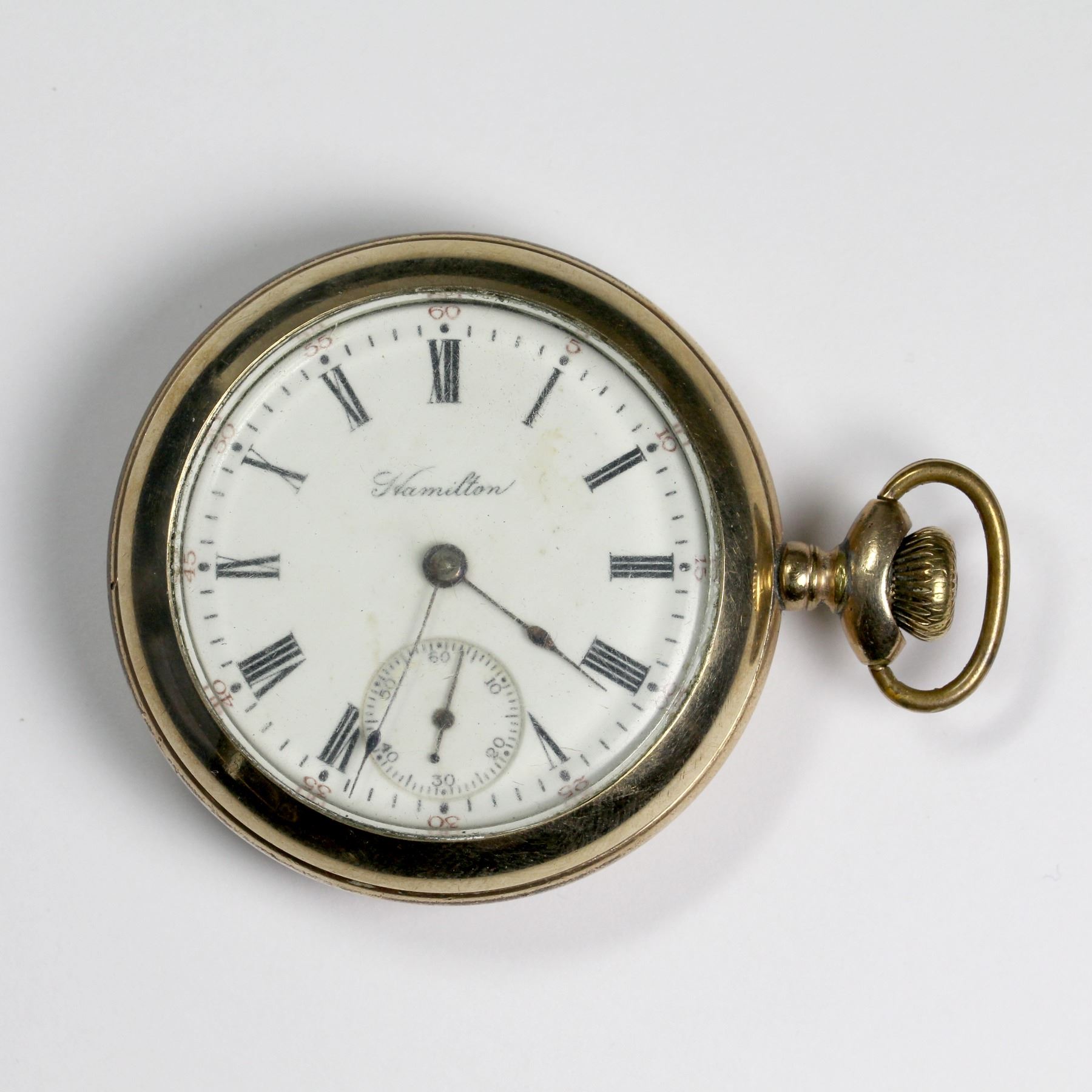 American. Circa 1909. Hamilton. Cases: Gold filled case. Marked, "Fortune A.W.C. Co. Gold Filled". 18 size (45mm movement diameter). Hunting case configuration. Running. Missing one main plate screw. Misshapen minute hand. Brassing to caseback. Running watches have not been tested for timekeeping accuracy and may require adjustment. The fact that a watch has been described as "running" provides no guarantee of its ability to continue to do so.