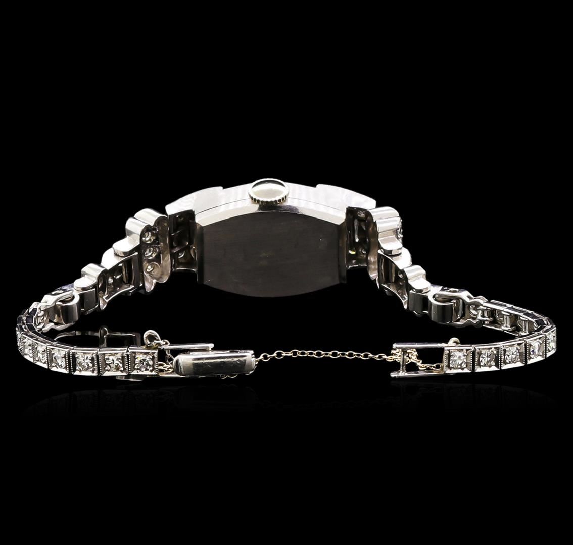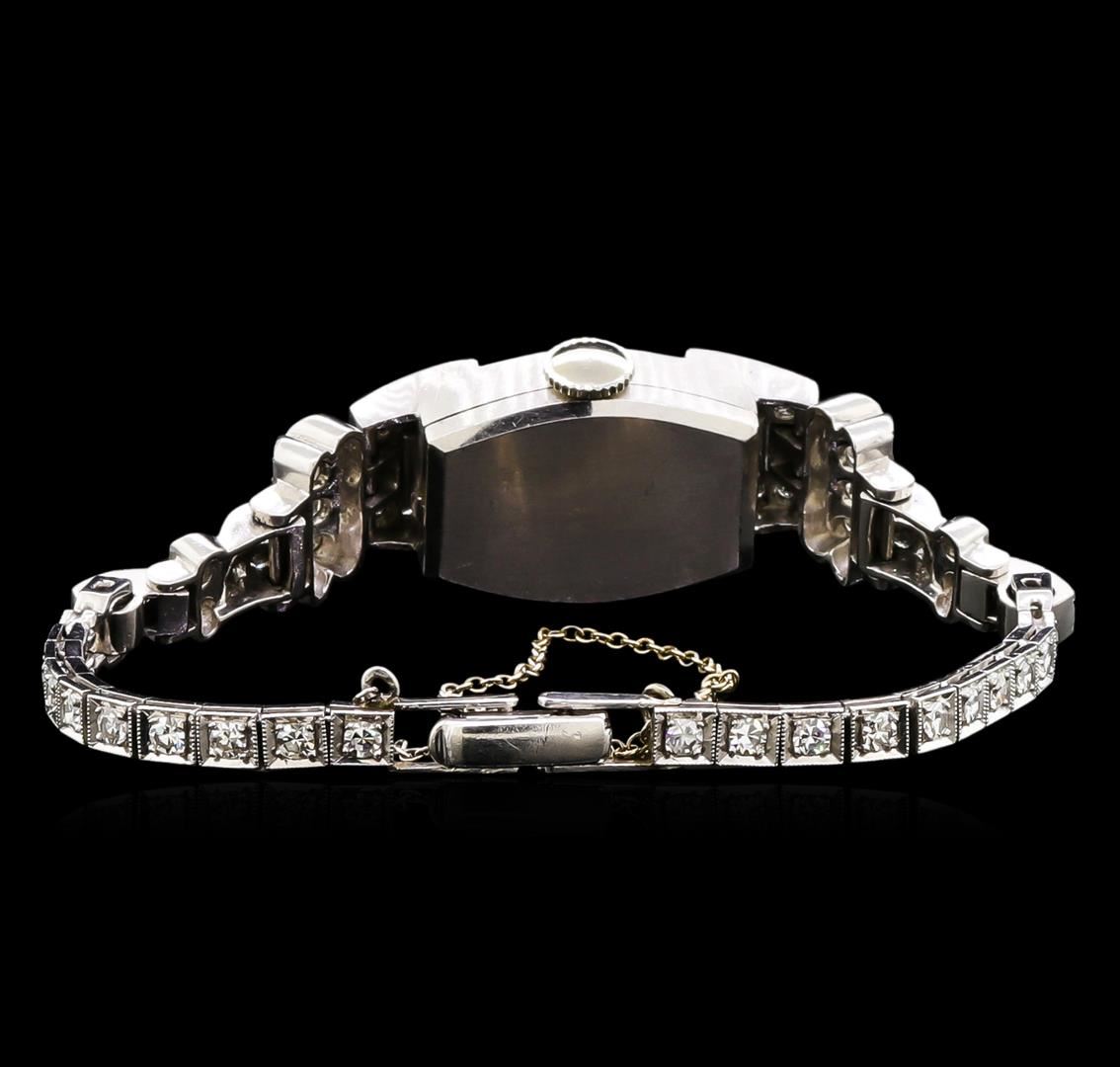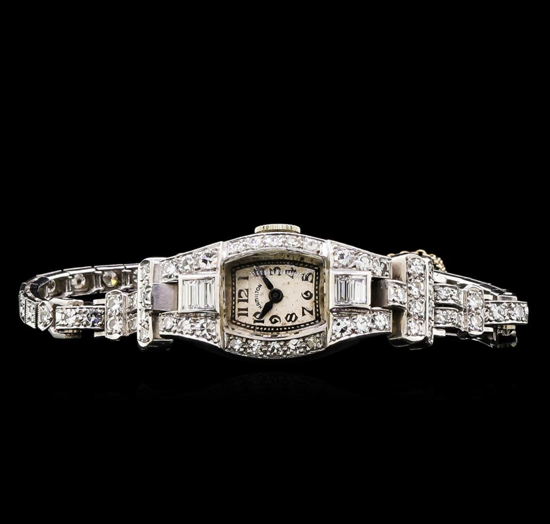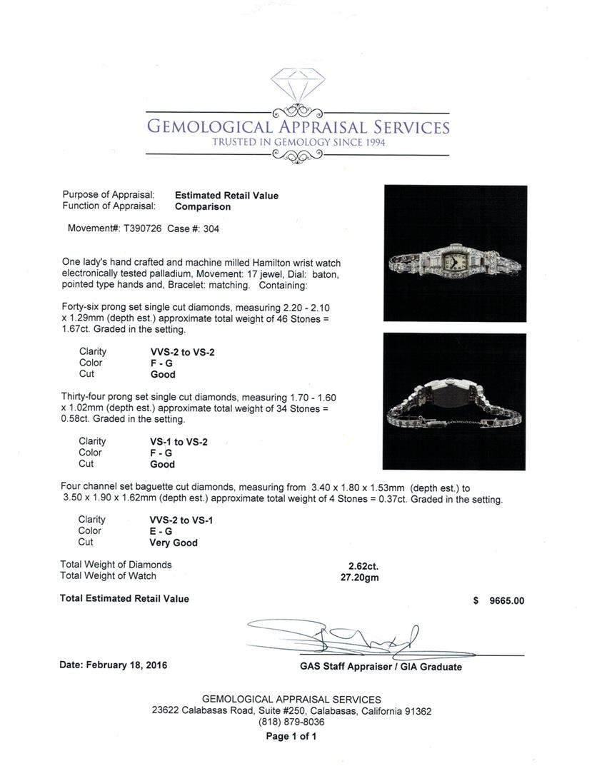 One lady's, hand crafted and machine milled Hamilton wrist watch electronically tested palladium, Movement: 17 jewel, Dial: baton, pointed type hands and, Bracelet: matching. Containing: Forty-Six prong set single cut diamonds, measuring 2.20 - 2.10 x 1.29mm (depth est.) approximate total weight of 46 Stones = 1.67ct. Graded in the setting. Clarity: VVS-2 to VS-2. Color: F - Good Thirty-Four prong set single cut diamonds, measuring 1.70 - 1.60 x 1.02mm (depth est.) approximate total weight of 34 Stones = 0.58ct. Graded in the setting. Clarity: VS-1 to VS-2. Color: F - Good Four channel set baguette cut diamonds, measuring from 3.40 x 1.80 x 1.53mm (depth est.) to 3.50 x 1.90 x 1.62mm (depth est.) approximate total weight of 4 Stones = 0.37ct. Graded in the setting. Clarity: VVS-2 to VS-1. Color: E - Very Good. Total Weight of Diamonds 2.62ct. Total Weight of Watch 27.20gm. GAS Appraised at $9,665.00.