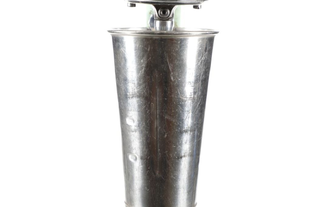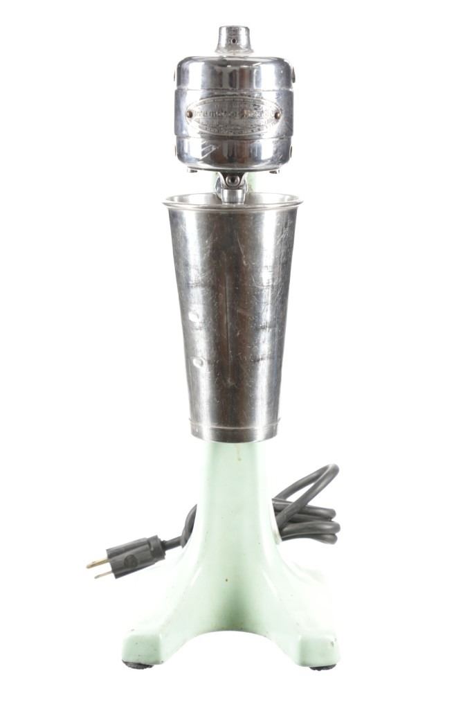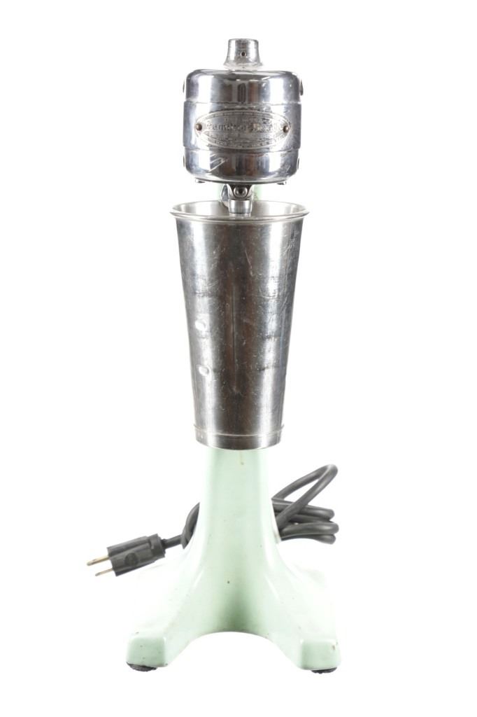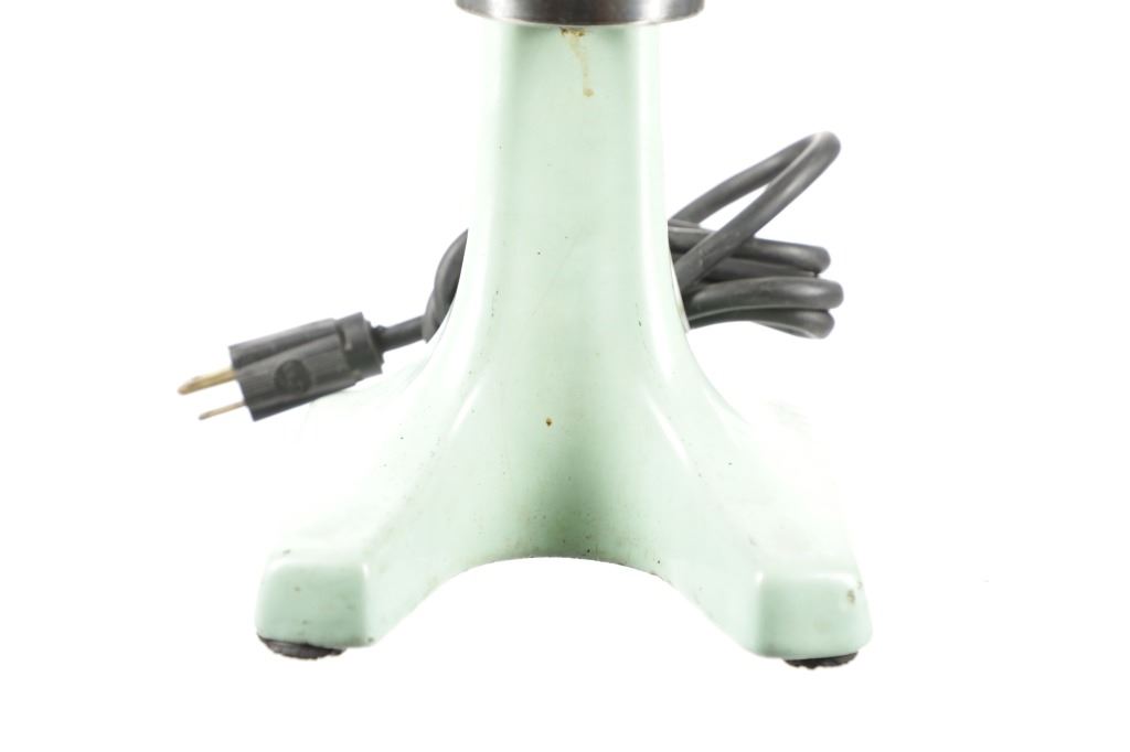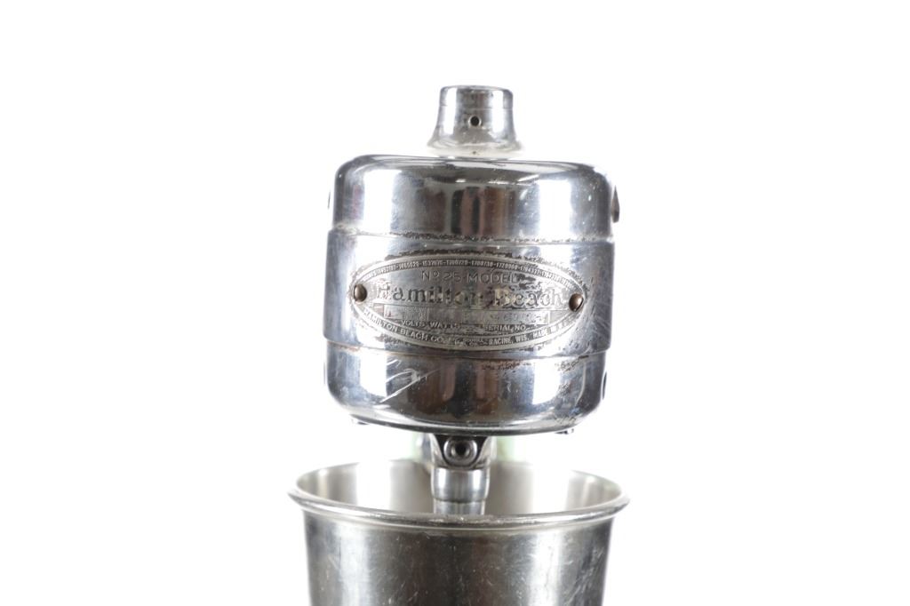 Featured in this lot is this Hamilton Beach model no. 25 soda fountain shop mixer. The mixer features a wonderfully and professionally crafted enameled jadeite colored (light green) construction that is nickel finish and a stainless steel cut. The condition of this soda mixer is well preserved with some slight patina adorning the enamel base and the motor mechanism shown at the top but otherwise shows a well preserved condition. The soda mixer is in working condition and has been tested. The measurements of this soda mixer is 6 1/4" x 6 1/4" x 17 1/2". The collective weight of this soda mixer is 13lb.