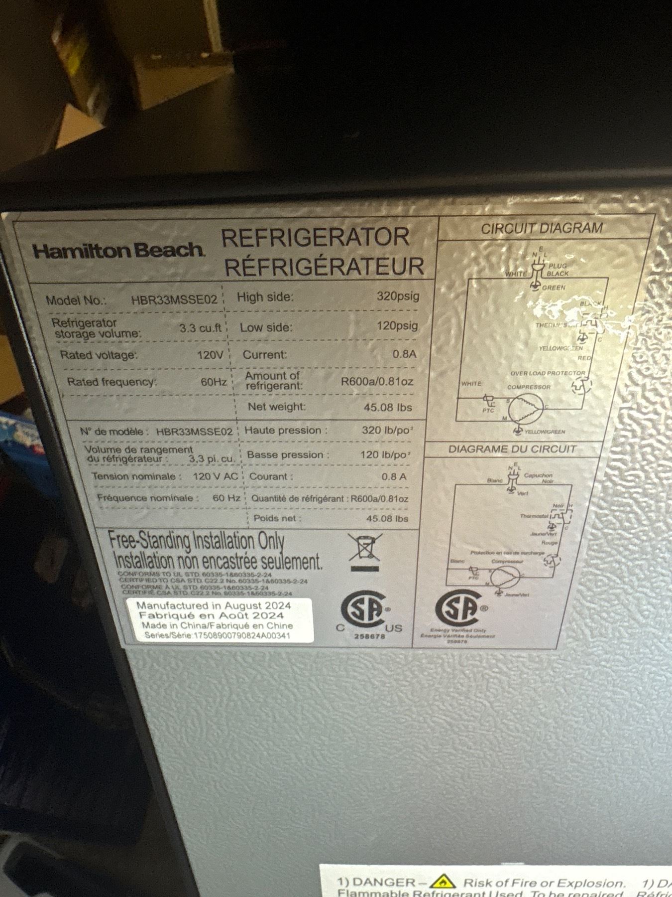 Hamilton Beach bar fridge (tested, starts up, not cooling)