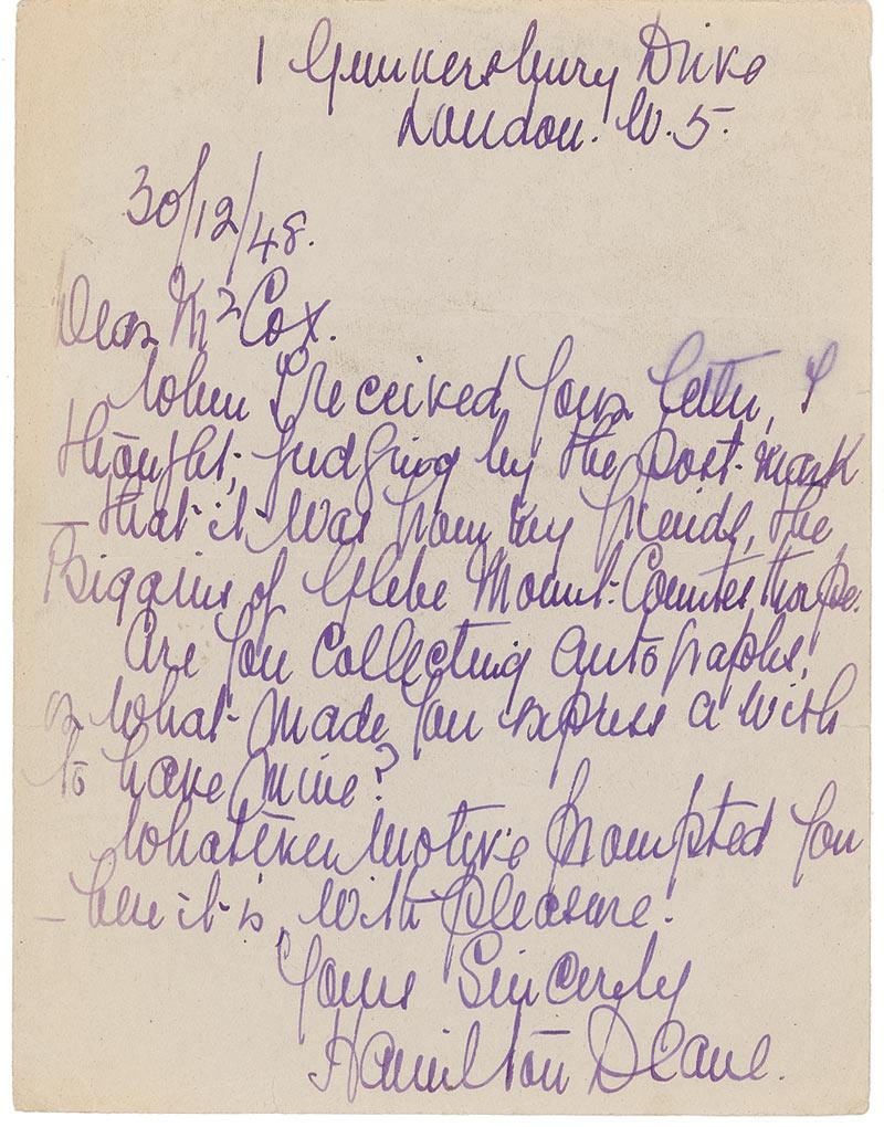 Playwright who adapted Dracula as a 1924 stage play from the novel of the same name by Bram Stoker, and subsequently revised by John L. Balderston. It was the first adaptation of the novel authorized by Stoker's widow, and has influenced many subsequent adaptations. The classic 1931 film version drew on the Deane-Balderston play. ALS, one page, 5.5 x 7, December 30, 1948. Letter to an admirer. In part: “I received your letter…Are you collecting autographs & what made you express a wish to have mine? Whatever motive prompted you—here it is, with pleasure.” In fine condition, with small edge separations to folds, a couple brushes to text, and some mild toning along top edge.