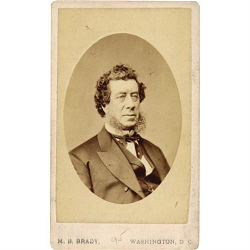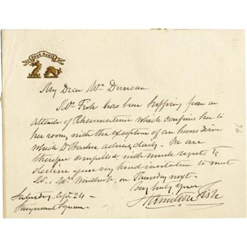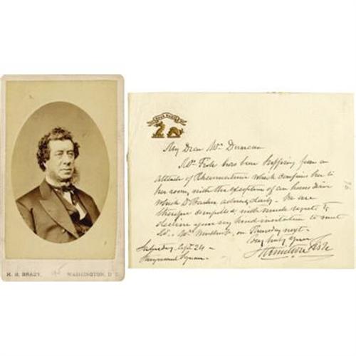 <B>Hamilton Fish Autograph Note Signed, </B></I> 4.5” x 3.5”, one page, on embossed card stock bearing the Fish crest in gold, April 24, Farragut Square Washington . Included is a Matthew Brady <I>carte de visite</B></I>of Fish, 2.5” x 4”. The note has remnants of mounting tape on the left side, else near fine. <I>From the collection of Henry E. Luhrs.</B></I><BR><BR><b>Shipping:</b> Flat Material, Small (<a target="_blank" href="http://www.heritageauctions.com/common/shipping.php">view shipping information</a>)
