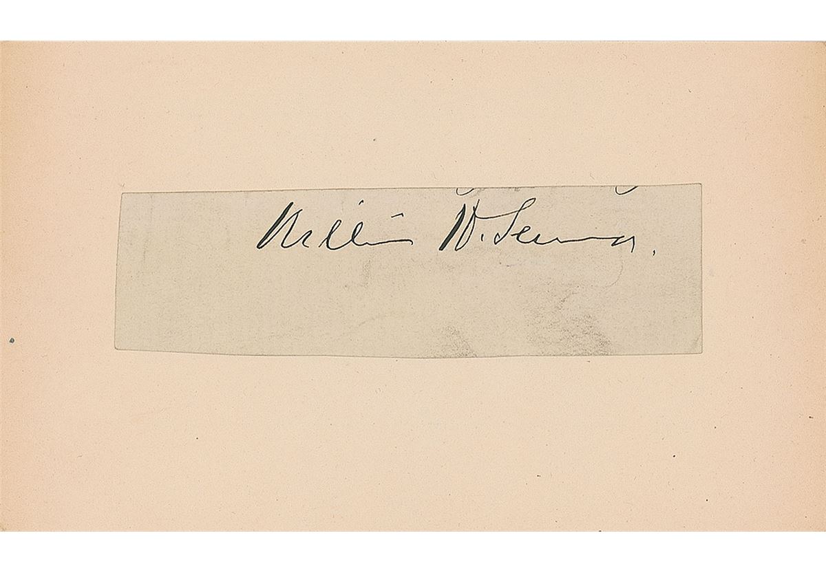Two items: an ink signature, “H. Fish,” on an off-white 3 x 1.25 slip clipped from an envelope; and an ink signature, “William H. Seward,” on an off-white 3.5 x 1 clipped slip. Both are affixed to 5 x 3 cards. Slight soiling, and some brushing to the Fish signature (a postmark touching the tip of the first letter), otherwise overall fine condition.
