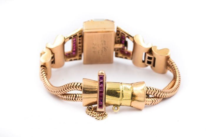 Retro Hamilton Pink Gold Ruby And Diamond Wristwatch
