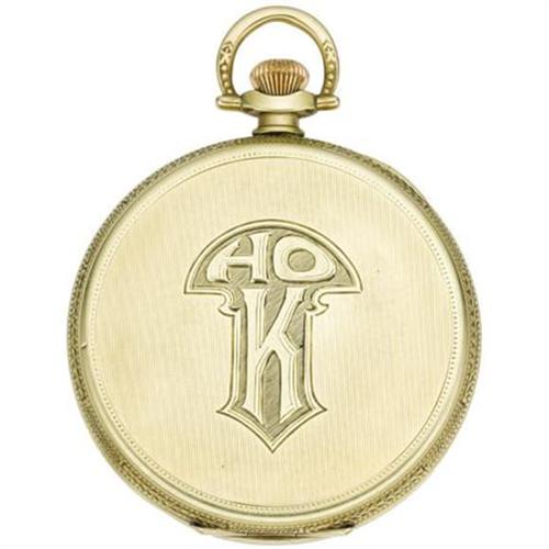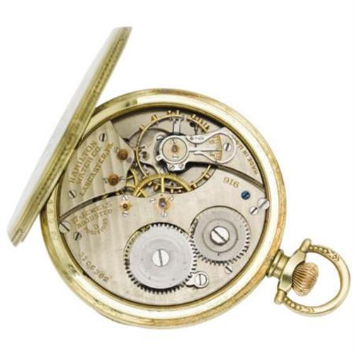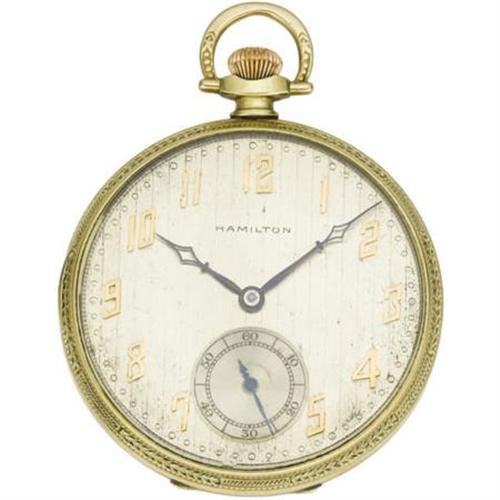 <B>Hamilton Gold-Filled Openface Pocket Watch</B></I><BR><BR>Case: 44 mm, circular, hinged 14k yellow gold-filled with decorative wallpaper panel, enhanced by the engraving "HOK", reference #666929<BR>Dial: goldtoned wallpaper panel texture, goldtoned numerals, blued steel hour and minute hands, together with sunken auxiliary sweep seconds<BR>Movement: 37 mm, 17 jewels, adjusted 3 positions, No. 3106382, Marked Hamilton Watch Co. Lancaster PA. 916<BR>Signed: triple signed on movement, case and dial <B>Condition Report:</B> Good condition.<BR><BR><BR><b>Shipping:</b> Miscellaneous Collectibles, Smal (<a target="_blank" href="http://www.heritageauctions.com/common/shipping.php">view shipping information</a>)