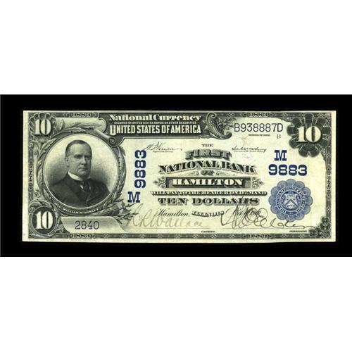 <B>Hamilton, IL</B></I> - $10 1902 Plain Back Fr. 627 <B>The First NB</B></I> Ch. # (M)9883<BR>This newly discovered piece is bright, with bold signatures. <B>Fine.</B></I><BR><I>From The Lincoln Collection</B></I><BR><BR><b>Shipping:</b> Coins & Currency (<a target="_blank" href="http://www.heritageauctions.com/common/shipping.php">view shipping information</a>)