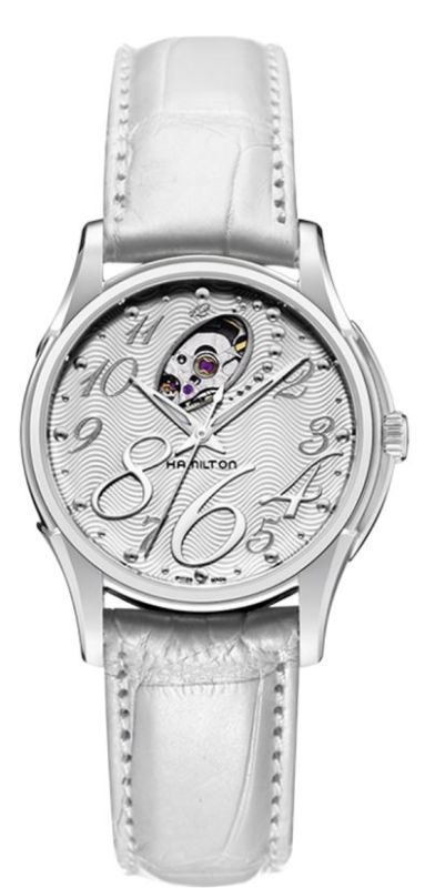Model: H32365313 - CASE = [Material:Stainless Steel], [Case Diameter:34], [Bezel:Fixed], [Case Back:Skeleton], [Water Resistant:50 Meters - 165 Feet], [Crystal:Scratch Resistant Sapphire], DIAL = [Color:Silver], MOVEMENT = [Type:Automatic], [Crown:Push In], BAND = [Clasp:Tang], [Type:White Alligator Leather], (Usually ships in 2 to 4 weeks.)