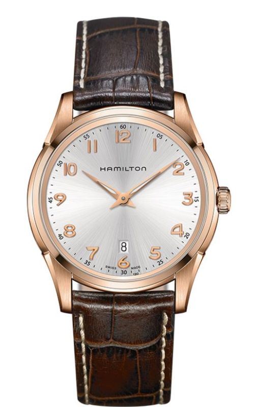 Model: H38541513 - CASE = [Material:Rose Gold-Tone Stainless Steel], [Case Diameter:42], [Bezel:Fixed], [Case Back:Solid], [Water Resistant:50 Meters - 165 Feet], [Crystal:Scratch Resistant Sapphire], DIAL = [Color:Silver], MOVEMENT = [Type:Quartz], [Crown:Push In], BAND = [Clasp:Tang], [Type:Brown Alligator Leather], (Usually ships in 1 to 2 business days.)