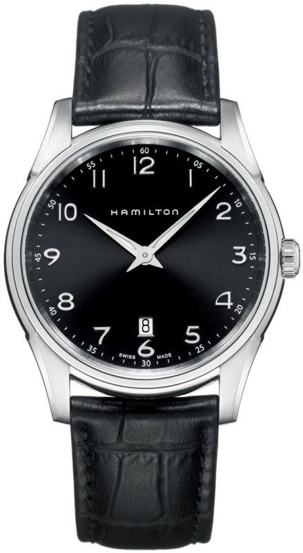 Model: H38511733 - CASE = [Material:Polished with Brushed Stainless Steel], [Case Diameter:42], [Water Resistant:50 Meters / 165 Feet], [Crystal:Scratch Resistant Sapphire], DIAL = [Color:Black], MOVEMENT = [Type:Battery Powered Quartz], BAND = [Clasp:Tang], [Type:Black Crocodile Leather], (Usually ships in 1 to 2 business days.)