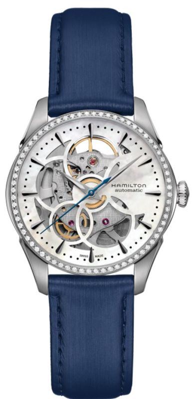Model: H42405991 - CASE = [Material:Stainless Steel], [Case Diameter:36], [Bezel:Fixed], [Case Back:Skeleton], [Water Resistant:50 Meters - 165 Feet], [Crystal:Scratch Resistant Sapphire], DIAL = [Color:Skeleton], MOVEMENT = [Type:Automatic], [Crown:Push In], BAND = [Clasp:Tang], [Type:Blue Leather], (Usually ships in 2 to 4 weeks.)