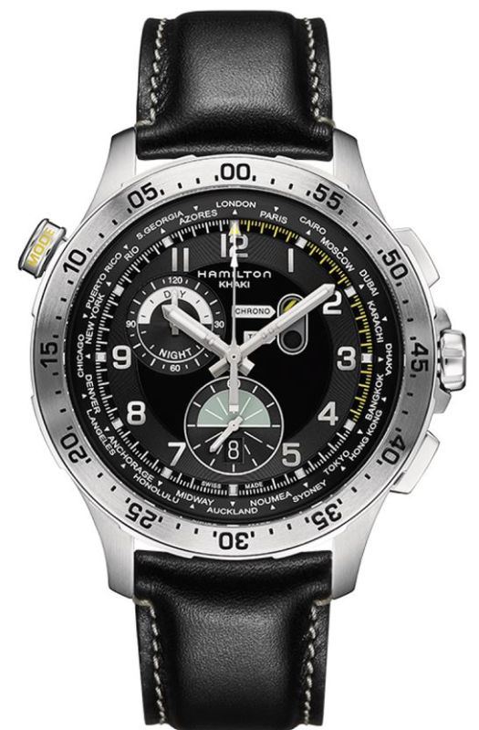 Model: H76714735 - CASE = [Material:Stainless Steel], [Case Diameter:45], [Bezel:Uni-Directional Rotating], [Water Resistant:100 Meters - 330 Feet], [Crystal:Scratch Resistant Sapphire], DIAL = [Color:Black], MOVEMENT = [Type:Quartz Chronograph], [Crown:Push In], BAND = [Clasp:Tang], [Type:Black Leather], (Usually ships in 2 to 4 weeks.)