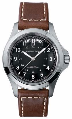 Model: H64455533 - CASE = [Material:Polished with Brushed Stainless Steel], [Case Diameter:40], [Water Resistant:50 Meters / 165 Feet], [Crystal:Scratch Resistant Sapphire],; DIAL = [Color:Black],; MOVEMENT = [Type:Automatic Self Winding],; BAND = [Clasp:Tang], [Type:Brown Calfskin Leather], (In Stock - Ready to ship.)