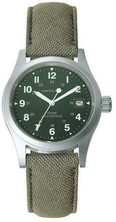 Model: H69419363 - CASE = [Material:Polished with Brushed Stainless Steel], [Case Diameter:38], [Water Resistant:50 Meters / 165 Feet], [Crystal:Scratch Resistant Sapphire], DIAL = [Color:Green], MOVEMENT = [Type:Manual Winding], BAND = [Clasp:Tang], [Type:Green Canvas], (Usually ships in 4 to 8 weeks.)