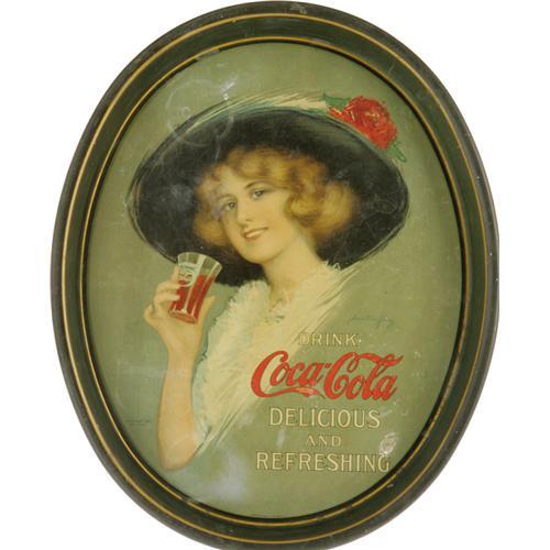 <B>Hamilton King 1913 Coca-Cola Tray.</B></I> One of the earlier trays produced for Coke by Passaic Metal Ware Co., it features the art of Hamilton King. This graceful lady wearing a large hat was also used by Coca-Cola Girl on small novelties and postcards. The tray is a 15" oval. Although this one has some defects, a glass ring near the top and some rubbing to the graphic in the wording, it is an extremely tough tray to acquire.