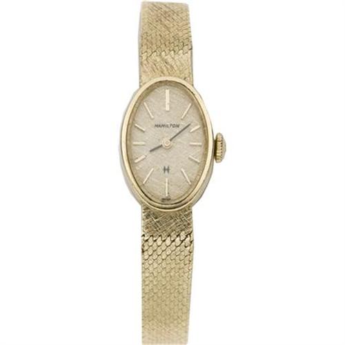 <B>Hamilton Lady's 14k Gold Integral Bracelet Wristwatch</B></I><BR><BR>Case: 22 x 15 mm, oval-shaped 14k yellow gold, #990833, marked Hamilton Watch Co. Lancaster, PA.<BR>Dial: textured goldtone with applied gilt Hour Indexes, black "Baton" hands, mineral crystal, marked Hamilton<BR>Movement: unadjusted 17 jewel, , #772, Hamilton Watch Co., Swiss<BR>Bracelet: 6-1/2 inches, integral 14k yellow gold bracelet with foldover clasp with Hamilton insignia.<BR>Notes: 25.70 grams. Triple signed Hamilton on the dial, movement and case. Watch is currently in working order.<BR><BR> <B>Condition Report:</B> Normal signs of wear as appropriate with age. Bracelet weave is a little loose below the 6 o'clock position. Watch sets, winds and runs properly.<BR><BR><b>Shipping:</b> Miscellaneous Collectibles, Smal (<a target="_blank" href="http://www.heritageauctions.com/common/shipping.php">view shipping information</a>)