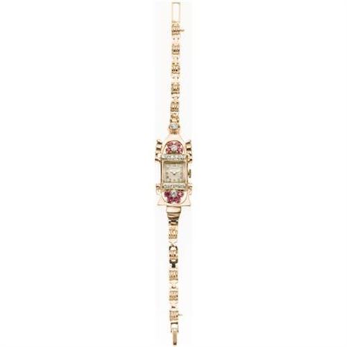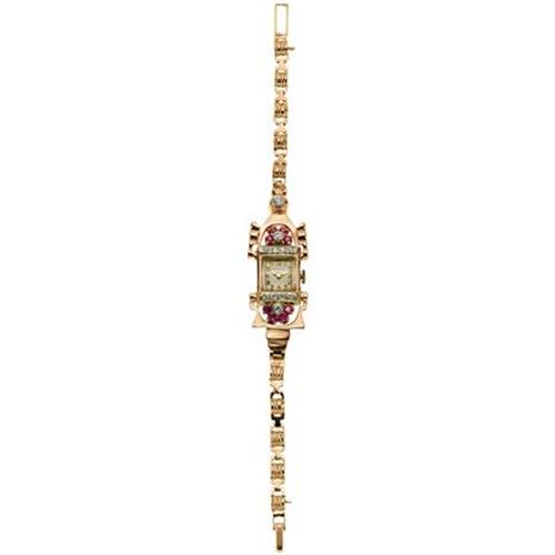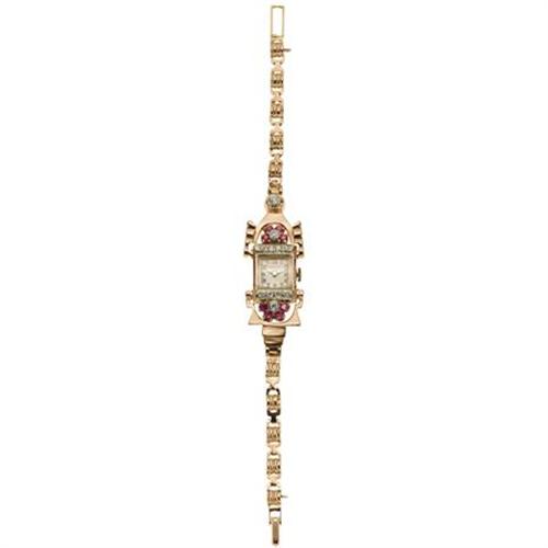 <B>Hamilton Lady's Diamond, Ruby, Rose Gold Wristwatch, Retro</B></I><BR><BR>Case: 31 x 14 mm, rectangle-shaped, 14k rose gold with hinged lugs together with European-cut diamonds and round-cut ruby accents<BR>Dial: silvered with applied goldtone Arabic numerals goldtone "Dauphine" hands and domed mineral crystal. Marked Hamilton<BR>Movement: Hamilton #911, 17 jewel, T35 737, signed Hamilton U.S.A. <BR>Bracelet: 14k rose gold fancy links with foldover clasp; 7 inches<BR>Stones: European-cut diamonds weighing a total of approximately 0.50 carat. Round-cut rubies weighing a total of approximately 0.40 carat <BR>Signed: Double signed Hamilton on the dial and movement <B>Condition Report:</B> Normal signs of wear as appropriate with age.<BR>Watch is in working order.<BR>Circa 1940.<BR><BR><b>Shipping:</b> Miscellaneous Collectibles, Smal (<a target="_blank" href="http://www.heritageauctions.com/common/shipping.php">view shipping information</a>)