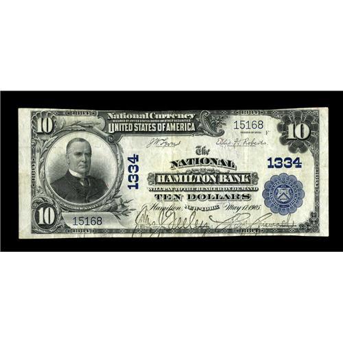 <B>Hamilton, NY</B></I> - $10 1902 Plain Back Fr. 624 <B>The National Hamilton Bank</B></I> Ch. # 1334<BR>This bank, the only issuer in the college town, is more common in First Charters than in Third Charters, with this the first $10 Blue Seal reported in any grade. Bright <B>Very Fine.</B></I><BR><BR><b>Shipping:</b> Coin/Currency (<a target="_blank" href="http://www.heritageauctions.com/common/shipping.php">view shipping information</a>)