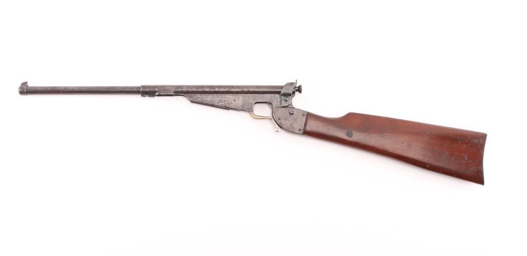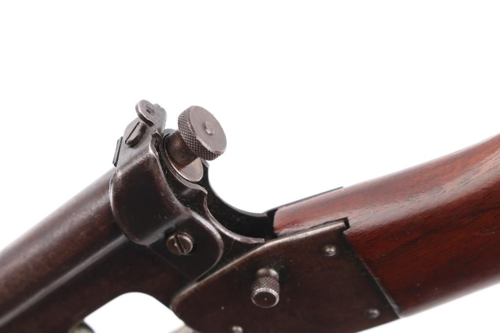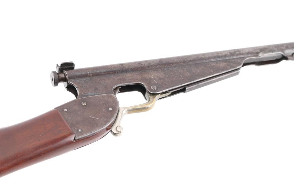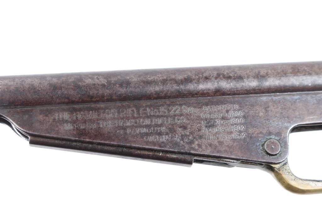 Youth rifle. This Hamilton Rifle Co. model 15 was produced from 1901 to 1910. Chambered for 22 SHORT. with a 8" brass lined barrel, front blade, fixed rear peep sight. Designed as a triggerguard under lever single shot, with loading port under the barrel. Cocking knob located at rear of frame. Walnut shoulder stock, steel buttplate. Bore is fair with some light scattered pitting, metal finish has turned a molted brown patina, wood is very good. These rifles were removed from the NFA list by the ATF and are considered C&R's. NRA Condition-Fair to Good. C&R Firearm.