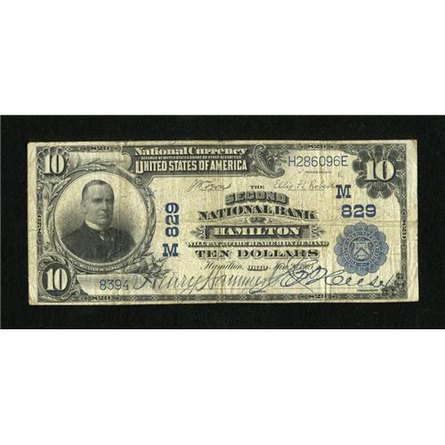 <B>Hamilton, OH</B></I> - $10 1902 Plain Back Fr. 624 <B>The Second NB</B></I> Ch. # (M)829<BR>This well signed issue boasts original, and solid paper. <B>Very Good-Fine.</B></I><BR><I>From The Collection of Greg Southward</B></I><BR><BR><b>Shipping:</b> Coins & Currency (<a target="_blank" href="http://www.heritageauctions.com/common/shipping.php">view shipping information</a>)