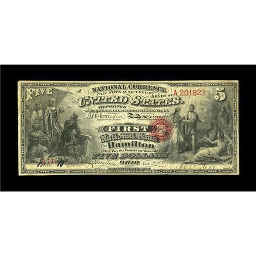 <B>Hamilton, OH</B></I> - $5 Original Fr. 394 <B>The First NB</B></I> Ch. # 56<BR>This nice mid-grade $5 is one of just two First Charters known on this bank. It is neatly margined and pen signed. <B>Fine-Very Fine.</B></I><BR><BR><b>Shipping:</b> Coins & Currency (<a target="_blank" href="http://www.heritageauctions.com/common/shipping.php">view shipping information</a>)