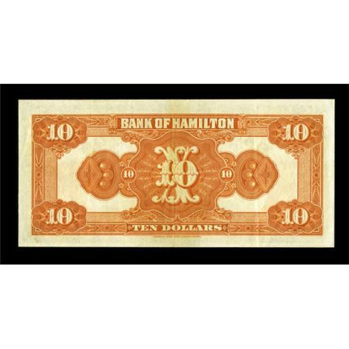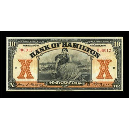<B>Hamilton, ON- Bank of Hamilton </B></I>$10 Mar. 1, 1922 Ch. # 345-22-04<BR> This and the next note come from the bank's "Jubilee Issue" of 1922, which commemorated the 50th anniversary of the founding of the bank. All of these notes are quite rare (or, in the restrained Canadian manner of speech used in Charlton, "quite elusive"), with just seven of the $10 notes known and just nine of the $25 specimens recorded in both private and institutional holdings combined. This $10 note is a lovely piece, with blazing colors and minimal evidence of any real circulation. <B>Extremely Fine.</B></I><BR><I>From The Thomas M. Flynn Collection</B></I><BR><BR><b>Shipping:</b> Coins & Currency (<a target="_blank" href="http://www.heritageauctions.com/common/shipping.php">view shipping information</a>)