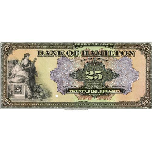 <B>Hamilton, ON- Bank of Hamilton</B></I> $25 Mar. 1, 1922 Ch. 345-22-06P Face Proof.<BR>This is a beautiful example that was trimmed for a mounting that never came. It is boldly embossed on thin paper with rich inks. There is one punch cancel plus three shadow cancels in the signature blocks. A pencilled control number as usual for proofs is found on the back, too. Three small stray black ink dots are found near the left-hand edge. A couple of pinholes and a small internal tear are also noticed in the vignette. <B>Choice Crisp Uncirculated, </B></I> PC.<BR><I>From The Collection of Richard A. Beck</B></I>