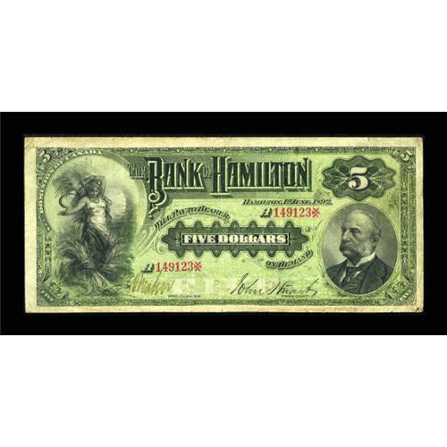 <B>Hamilton, ON- The Bank of Hamilton</B></I> $5 June 1, 1892 Ch. # 345-16-02a<BR> This bank is known for its handsome and well executed designs. All of the 1892 denominations are scarce, with only the $5 offered here being actually collectible. Bright <B>Fine+,</B></I> a very tough note especially in this state of preservation, as the Charlton catalogue prices these notes only through the grade of Very Fine.<BR><I>From The Thomas M. Flynn Collection</B></I><BR><BR><b>Shipping:</b> Coins & Currency (<a target="_blank" href="http://www.heritageauctions.com/common/shipping.php">view shipping information</a>)