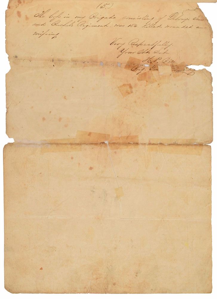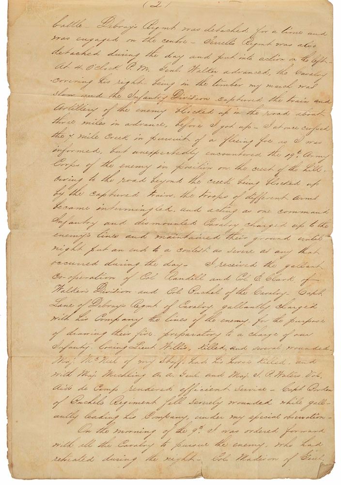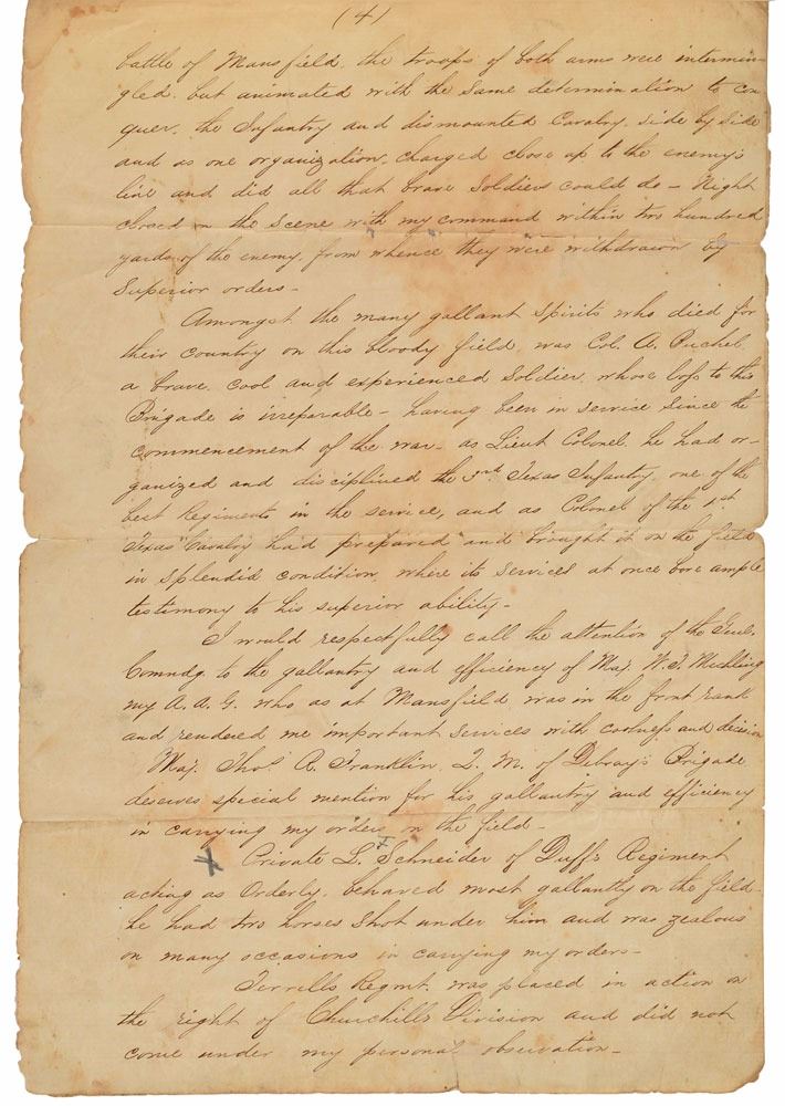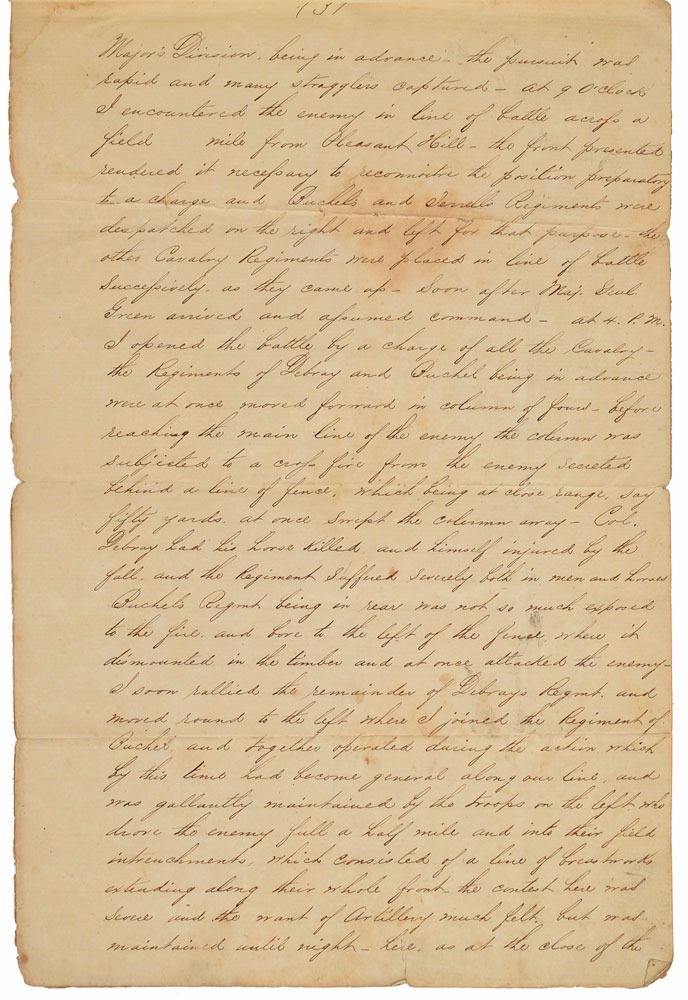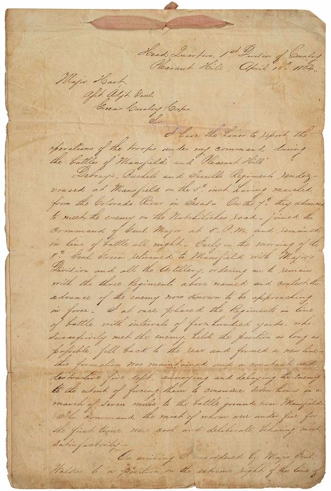 Lengthy Civil War-dated handwritten manuscript signed "H. P. Bee," five pages, 7.75 x 11.75, April 10, 1864. Written by Bee while stationed at the headquarters of the 1st Cavalry Division in Pleasant Hill, Louisiana, a battle report directed to "Major Hart, Asst. Adjt Genl, Green's Cavalry Corps," in part: "I have the honor to report the operations of the troops under my command during the Battle of Mansfield and Pleasant Hill. Debray’s, Buchel’s and Terrell’s Regiments rendezvoused at Mansfield having marched from the Colorado River in Texas. They advanced to meet the enemy now known to be approaching enforce. I at once placed the regiment in line of battle with intervals of 500 yards, who successfully met the enemy. Of the command the most of whom were under fire for the first time, were cool and deliberate behaving most satisfactorily. On arriving I was ordered by major Genl. Walker to a position on the extreme right of the line of battle. Debray’s Regmt was detached for a time and was engaged on the centre—Terrell’s Regmt was also detached during the day and put into action on the left. At 4 o’clock P. M. Genl. Walker advanced the Cavalry covering his right, being in the timber my march was slow and the Infantry Division captured the train and Artillery of the enemy blocked up in the road about three miles in advance…I at once crossed the 4 mile creek in pursuit of a fleeing foe as I was informed, but unexpectedly encountered the 19th Army Corps of the enemy in position on the crest of the hill, owing to the road beyond the creek being blocked up by the captured train. The troops of different arms became intermingled, and acting as one command Infantry and dismounted cavalry charges up to the enemy’s line and maintained their ground until night put an end to a contest as severe as any that occurred during the day. I received the gallant co-operation of Col. Randall of the Cavalry, Capt. Lane of Debray’s Regmt of Cavalry gallantly charged with his company the lines of the enemy for the purpose of drawing their fire preparatory to a charge of our Infantry, losing Lieut. Willis, killed and several wounded…On the morning of the 9th I was ordered forward with all the cavalry to pursue the enemy, who had retreated during the night…at 9 o’clock I encountered the enemy in line of battle across a field mile from Pleasant Hill—the front presented rendered it necessary to reconnoiter the position preparatory to a charge…the other Cavalry Regiments were placed in line of battle successively, as they came up…At 4 p.m. I opened the battle by a charge of all the Cavalry—the Regiments of Debray and Buchel being in advance were at once move forward in column…before reaching the main line of the enemy the column was subjected to a cross fire from the enemy secreted behind a line of fence, which being at close range, say fifty yards, at once swept the column away…the Regiment suffered severely both in men and horses…I soon rallied the remainder of Debray’s Regmt and moved round to the left where I joined the Regiment of Buchel…the contest here was severe and the want of Artillery much felt but was maintained until night…The loss in my Brigade consisting of Debray’s, Terrell’s, and Buchel’s Regiment was 164 killed, wounded, and missing.” Bee has signed again within the docketing on the reverse of the final page. In condition, with heavy soiling and wear, and tears to the last page repaired with very old tape.