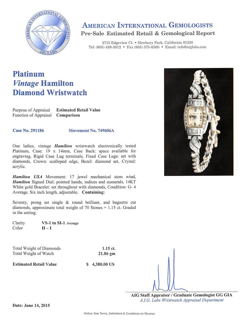 One ladies, vintage Hamilton wristwatch electronically tested Platinum, Case: 19 x 14mm, Case Back: space available for engraving, Rigid Case Lug terminals, Fixed Case Lugs: set with diamonds, Crown: scalloped edge, Bezel: diamond set, Crystal: acrylic. Hamilton USA Movement: 17 jewel mechanical stem wind, Hamilton Signed Dial: pointed hands, indices and numerals, 14KT White gold Bracelet: set throughout with diamonds, Condition: G- 4 Average. Six inch length, adjustable. Containing: Seventy, prong set single & round brilliant, and baguette cut diamonds, approximate total weight of 70 Stones = 1.15ct. Graded in the setting. Clarity: VS-1 to SI-1 Average. Color: H - I. Total Weight of Diamonds 1.15ct. Total Weight of Watch 21.86 grams. AIG Appraised at $4,380.00.