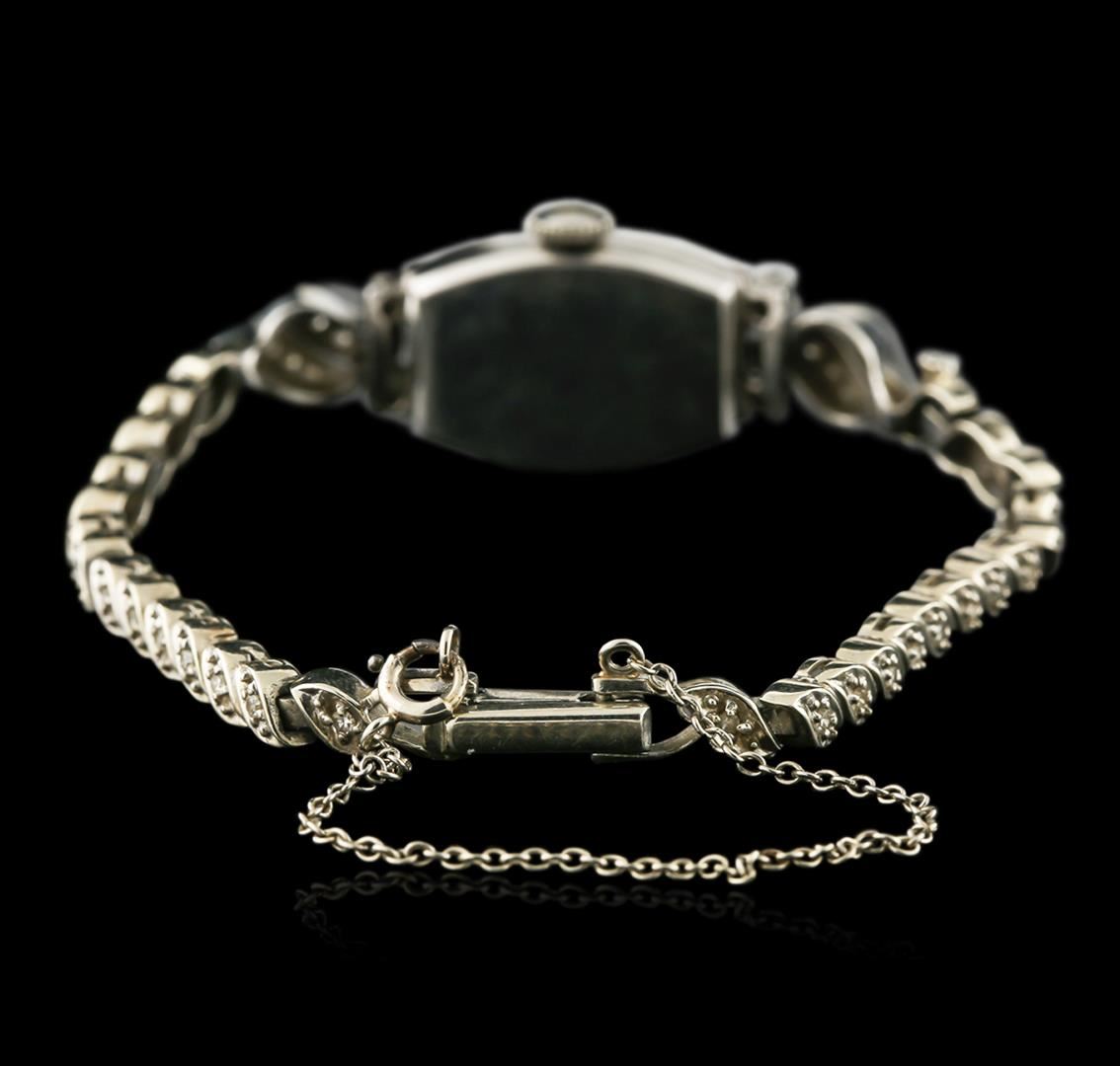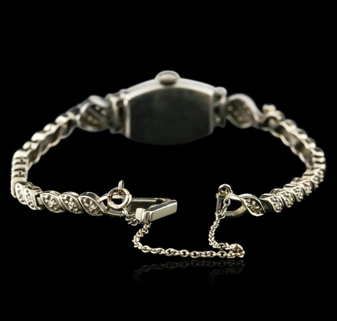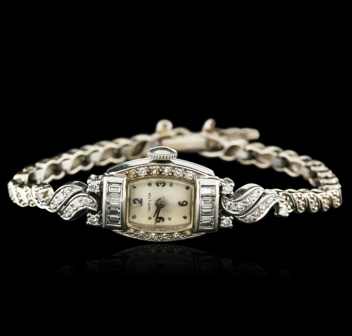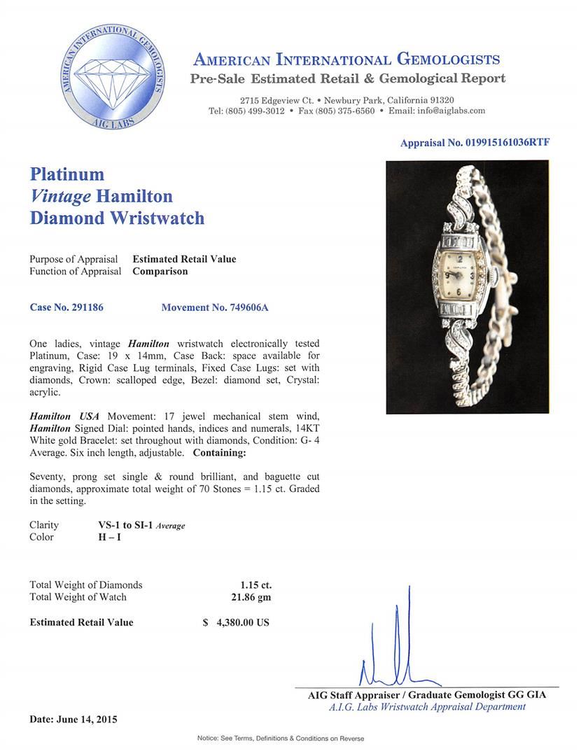 One ladies, vintage Hamilton wristwatch electronically tested Platinum, Case: 19 x 14mm, Case Back: space available for engraving, Rigid Case Lug terminals, Fixed Case Lugs: set with diamonds, Crown: scalloped edge, Bezel: diamond set, Crystal: acrylic. Hamilton USA Movement: 17 jewel mechanical stem wind, Hamilton Signed Dial: pointed hands, indices and numerals, 14KT White gold Bracelet: set throughout with diamonds, Condition: G- 4 Average. Six inch length, adjustable. Containing: Seventy, prong set single & round brilliant, and baguette cut diamonds, approximate total weight of 70 Stones = 1.15ct. Graded in the setting. Clarity: VS-1 to SI-1 Average. Color: H - I. Total Weight of Diamonds 1.15ct. Total Weight of Watch 21.86 grams. AIG Appraised at $4,380.00.