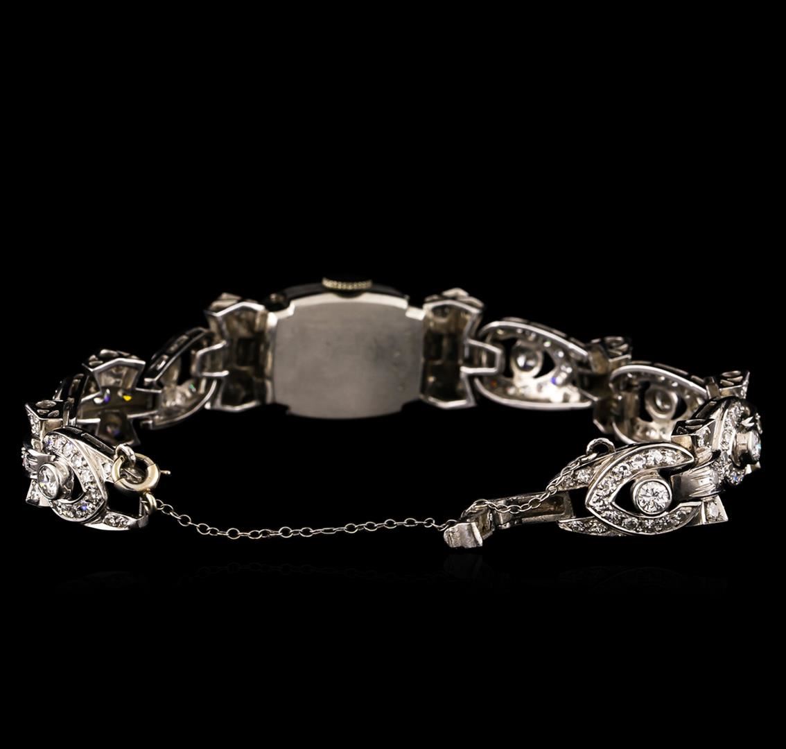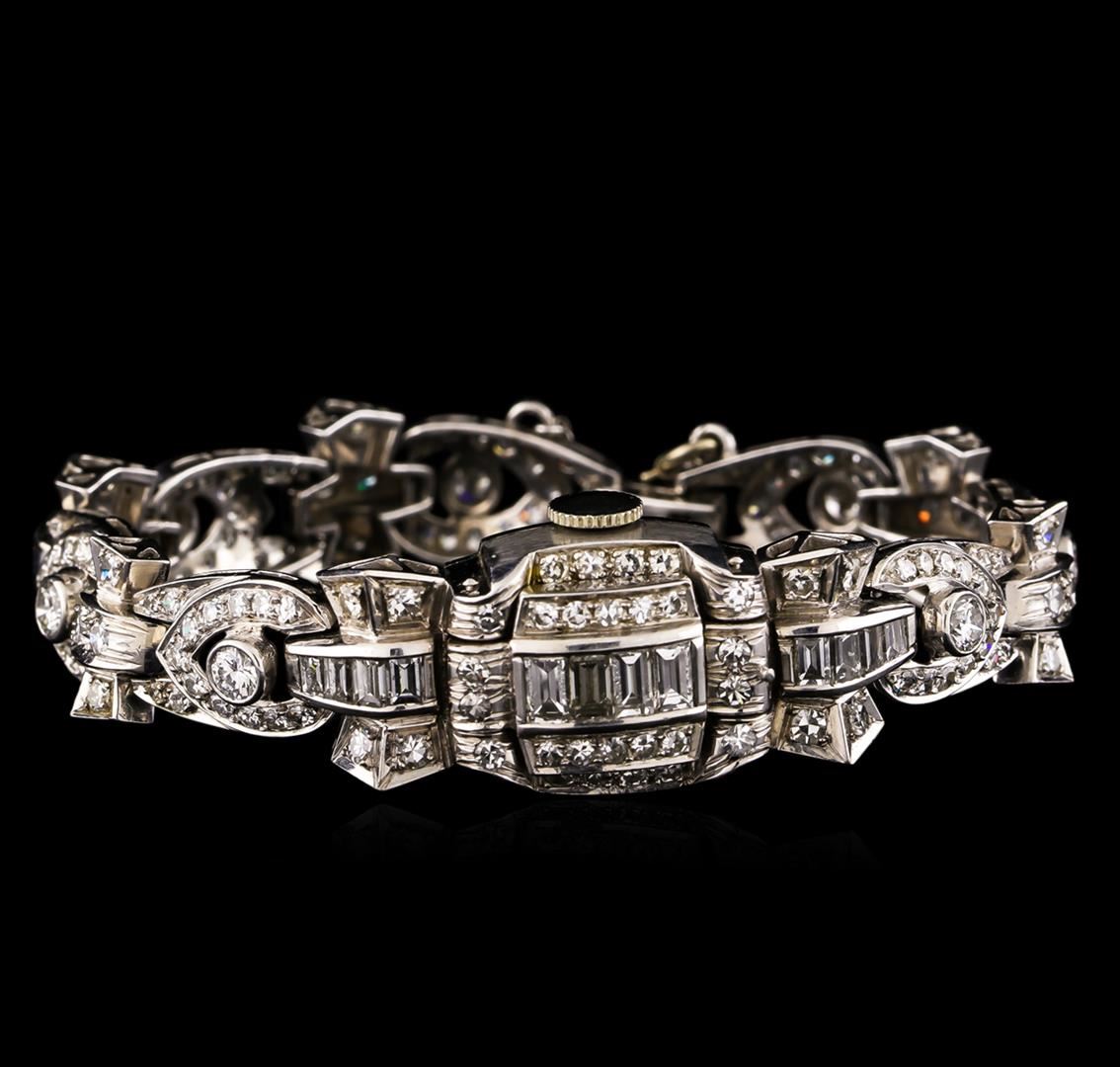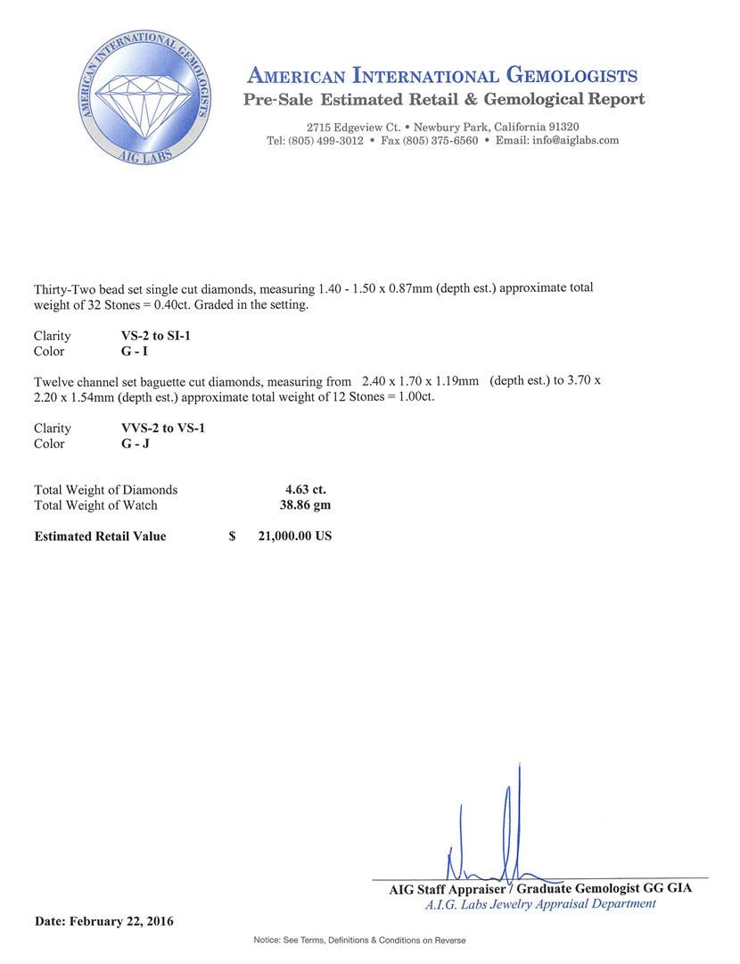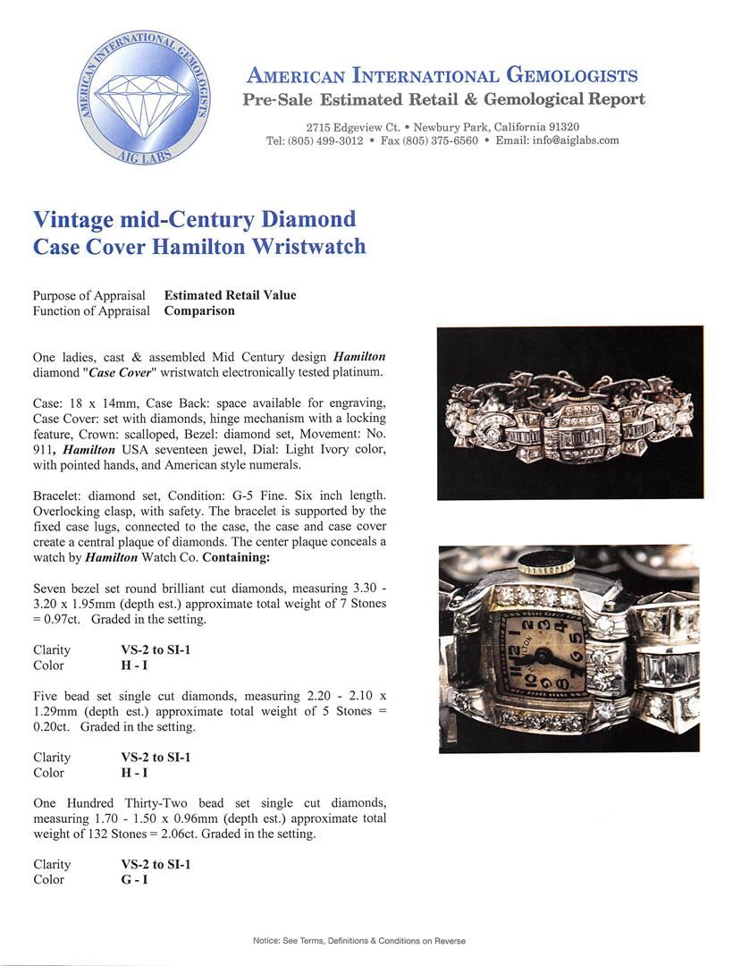 One ladies, cast & assembled Mid Century design Hamilton diamond "Case Cover" wristwatch electronically tested platinum. Case: 18 x 14mm, Case Back: space available for engraving, Case Cover: set with diamonds, hinge mechanism with a locking feature, Crown: scalloped, Bezel: diamond set, Movement: No. 911, Hamilton USA seventeen jewel, Dial: Light Ivory color, with pointed hands, and American style numerals. Bracelet: diamond set, Condition: G-5 Fine. Six inch length. Overlocking clasp, with safety. The bracelet is supported by the fixed case lugs, connected to the case, the case and case cover create a central plaque of diamonds. The center plaque conceals a watch by Hamilton Watch Co. Containing: Seven bezel set round brilliant cut diamonds, measuring 3.30 - 3.20 x 1.95mm (depth est.) approximate total weight of 7 Stones = 0.97ct. Graded in the setting. Clarity: VS-2 to SI-1. Color: H - I Five bead set single cut diamonds, measuring 2.20 - 2.10 x 1.29mm (depth est.) approximate total weight of 5 Stones = 0.20ct. Graded in the setting. Clarity: VS-2 to SI-1. Color: H - I One Hundred Thirty-Two bead set single cut diamonds, measuring 1.70 - 1.50 x 0.96mm (depth est.) approximate total weight of 132 Stones = 2.06ct. Graded in the setting. Clarity: VS-2 to SI-1. Color: G - I. Thirty-Two bead set single cut diamonds, measuring 1.40 - 1.50 x 0.87mm (depth est.) approximate total weight of 32 Stones = 0.40ct. Graded in the setting. Clarity: VS-2 to SI-1. Color: G - I Twelve channel set baguette cut diamonds, measuring from 2.40 x 1.70 x 1.19mm (depth est.) to 3.70 x 2.20 x 1.54mm (depth est.) approximate total weight of 12 Stones = 1.00ct. Clarity: VVS-2 to VS-1. Color: G - J. Total Weight of Diamonds 4.63ct. Total Weight of Watch 38.86gm. AIG Appraised at $21,000.00.