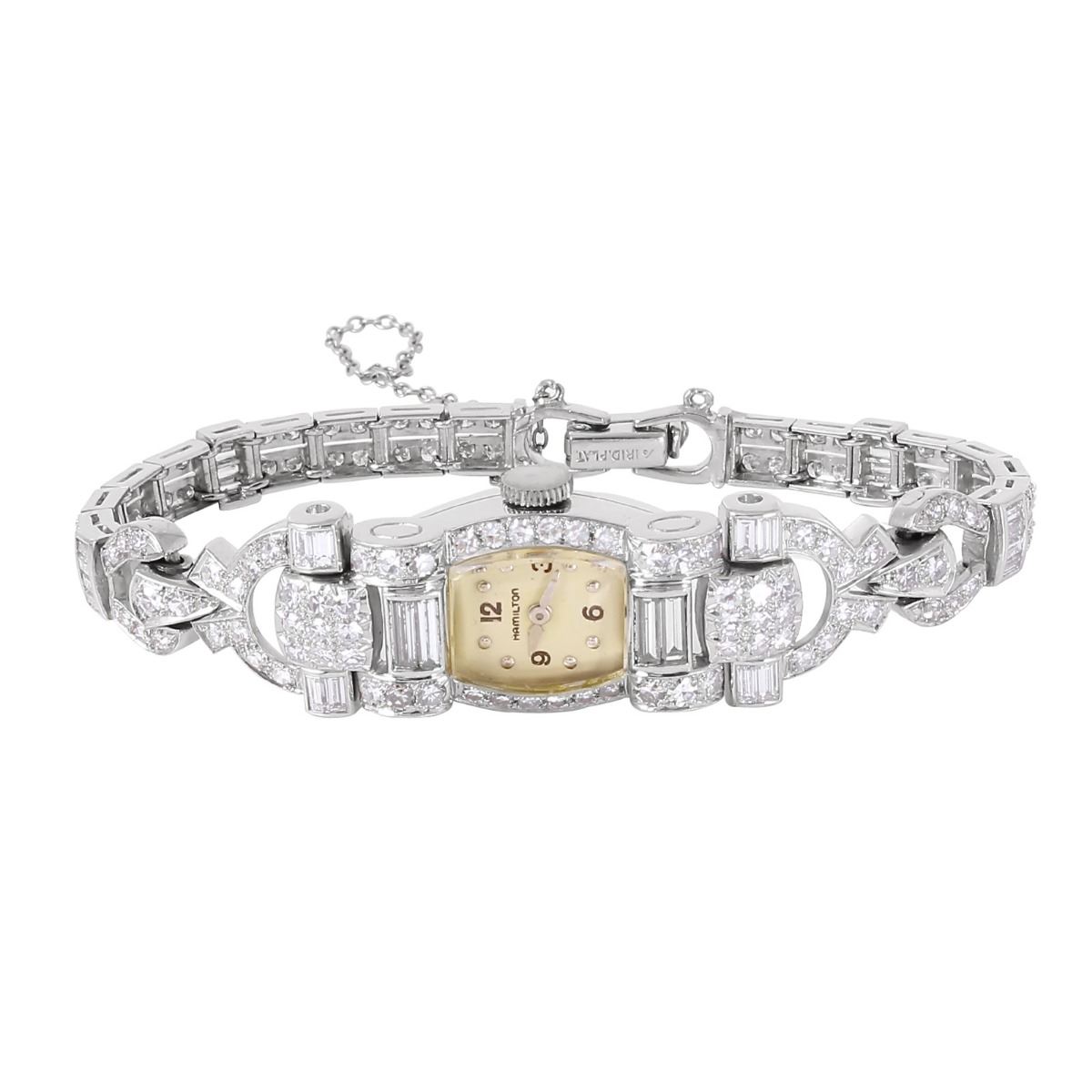 Exquisite and tasteful ladies genuine authentic designer Hamilton platinum watch with diamonds Circa 1930's up for grabs! This one of a kind find sparkles with an array of invisibly channel set baguette and round brilliant diamonds that adorn the open geometric platinum bracelet links and face, totaling 4.25cts. Held on securely with a fold over clasp and safety chain. Total weight of watch: 34.50 grams. The descriptions listed should not be construed as an appraisal. The detail is provided as a guideline for color, clarity, weights and measurements to the best of our ability. We welcome inspections. WE SHIP WORLDWIDE!