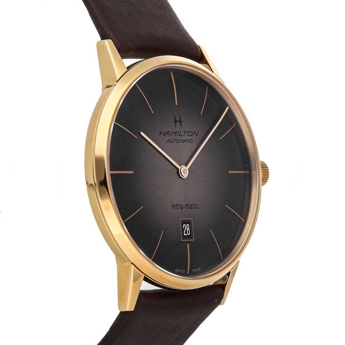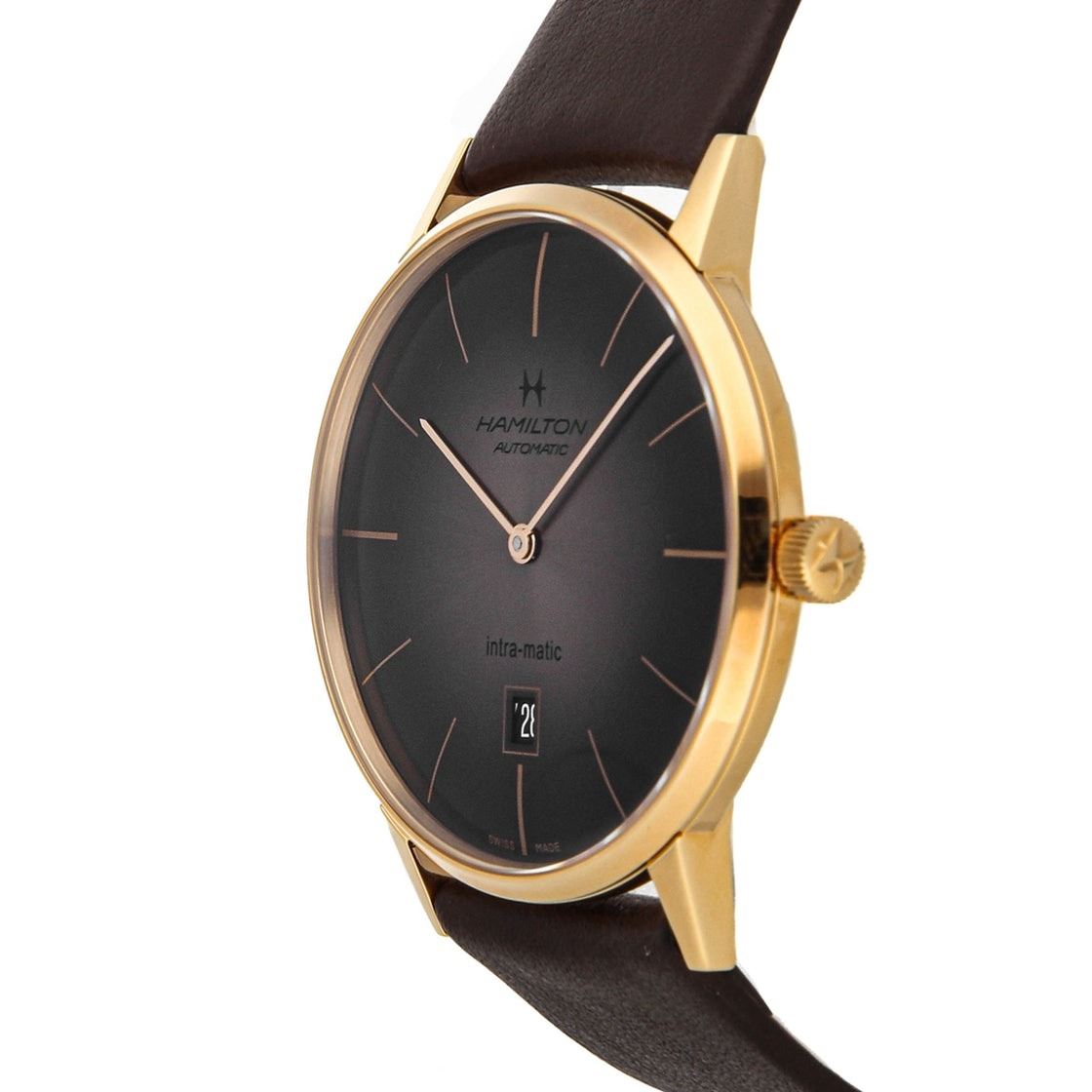 Pre-Owned Hamilton American Classic Intra-Matic (H38745501) self-winding automatic watch, features a 42mm rose gold plated case surrounding a brown dial on a brown leather strap with a rose gold plated tang buckle.