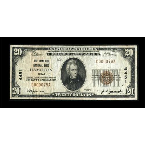 <B>Hamilton, TX</B></I> - $20 1929 Ty. 1 <B>The Hamilton NB</B></I> Ch. # 4451<BR> This note is one of only 7 small in the census for this Hamilton County bank that was managed by family members C.B and J.T. James. This is a bright <B>Fine </B></I>note with many, many pinholes. Nonetheless, it is a note that has resided in a couple of the better Texas collections over the years.<BR><BR><b>Shipping:</b> Coins & Currency (<a target="_blank" href="http://www.heritageauctions.com/common/shipping.php">view shipping information</a>)