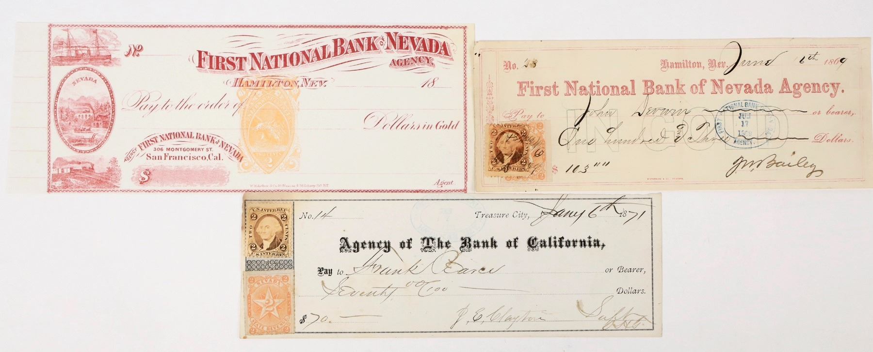 Lot of 3 different. 1) First National Bank of Nevada Agency, Hamilton, 1869. This check was payable in gold, unusual in Nevada at the time. Founded in 1868, Hamilton was estimated to have a population of 12,000 just a year later. The boom was short-lived and in the 1870 census the population was down to 3,915. After a disastrous fire three years later, most of the town was never rebuilt and the population declined to about 500. This bank was also short-lived and likely didn't last more than two years. Rare. 2) Same bank. An unused 18__ draft featuring the Nevada State Seal with a train and a ship signifying commerce. 3) Agency of the Bank of California, Treasure City, 1871. Bank check with both US and Nevada adhesive revenue stamps. First known as Tesora, the boom town on the other side of Treasure Hill was incorporated as Treasure City in 1869. The new town soon had a population of some 7,000 and the Bank of California was there to serve the residents. However, within a year the population had quickly declined to about 500. The town was disincorporated by the Nevada Legislature in 1879, but the local Bank of California had closed its doors long before then. Rare. When the "Rush to White Pine" began in 1868, the First National Bank of Nevada in San Francisco decided to capitalize on the new boom town. Soon an agency bank appeared in Hamilton in White Pine County, followed by an agency of the Bank of California in neighboring Treasure City.