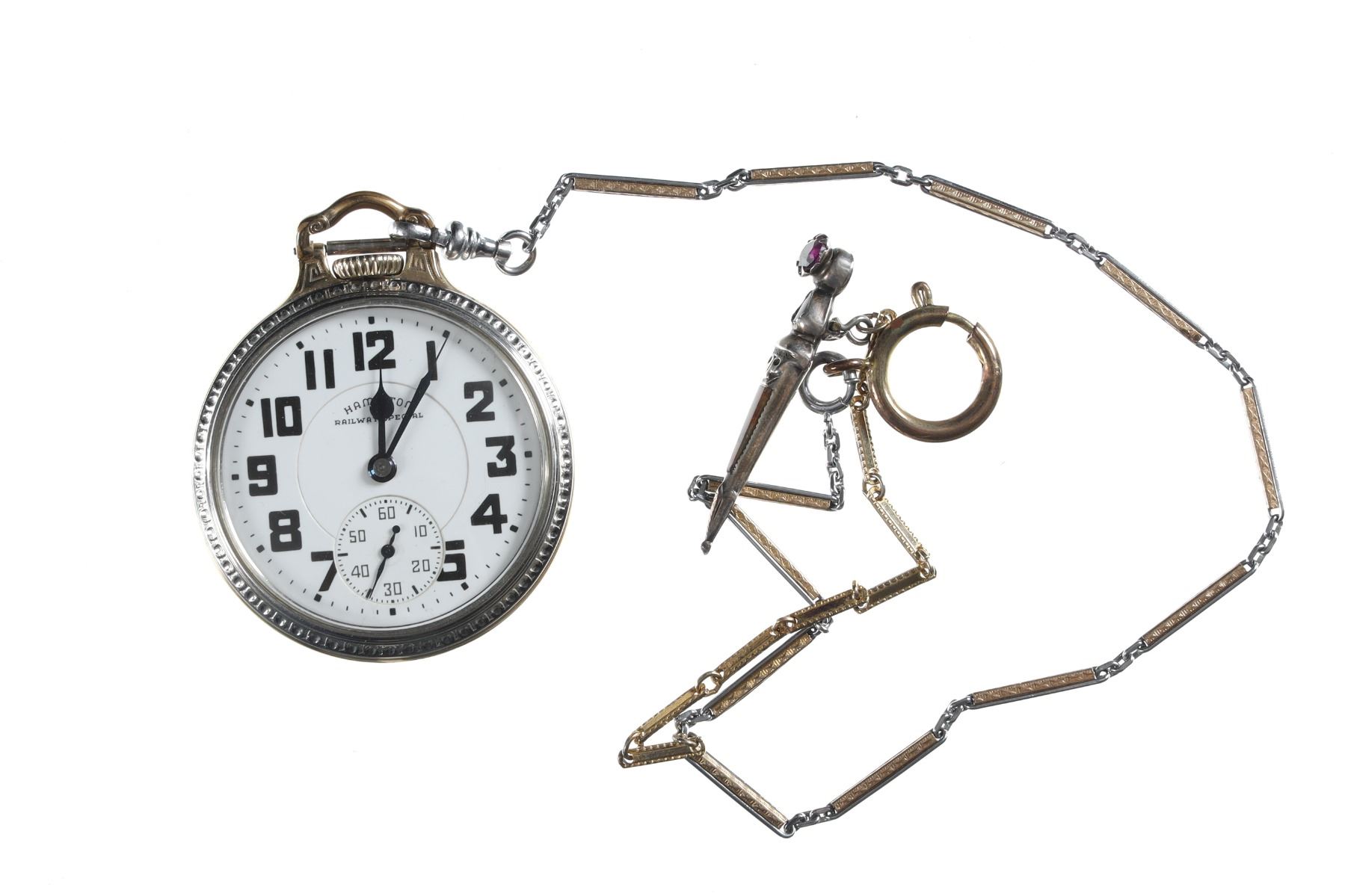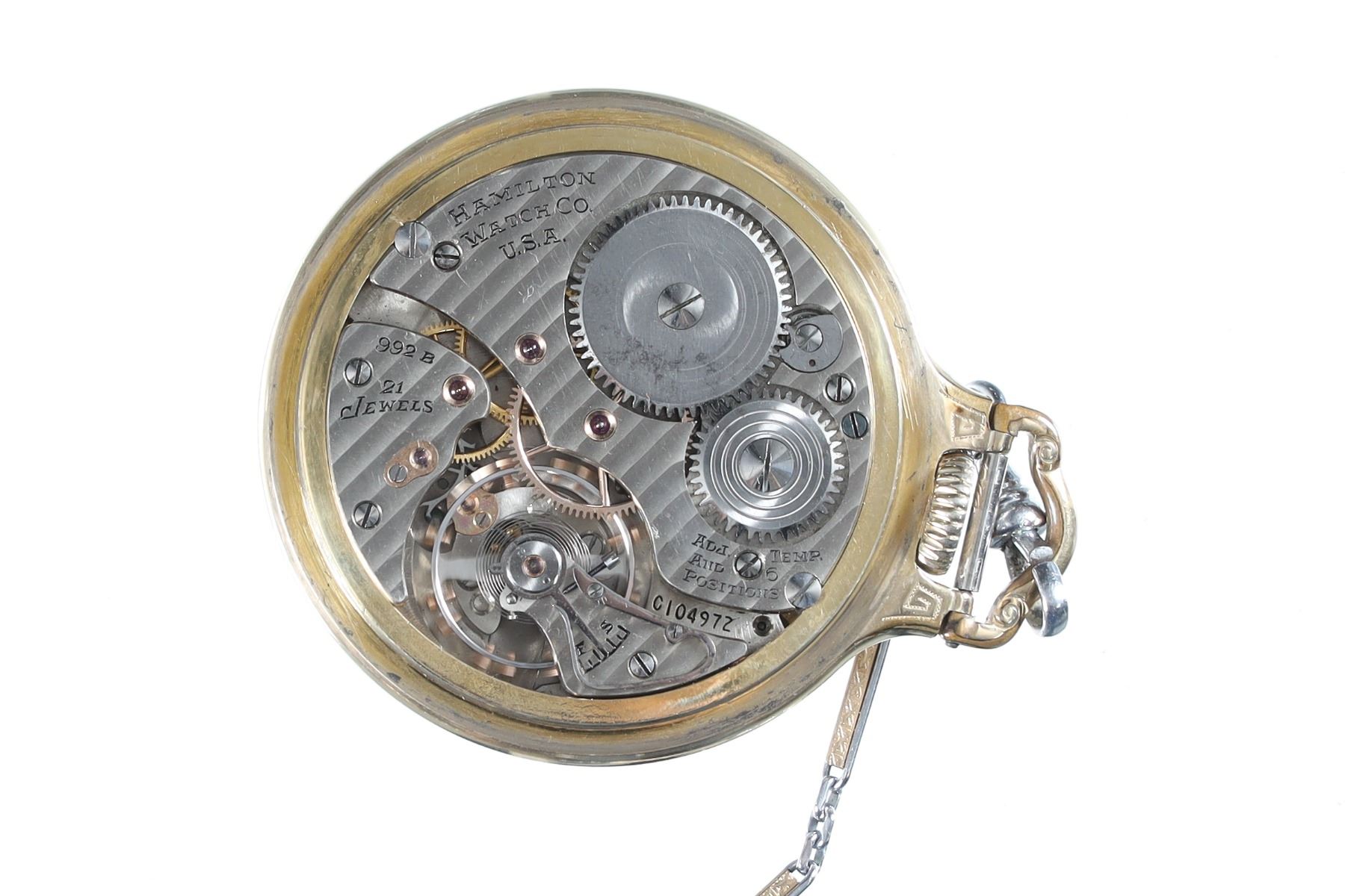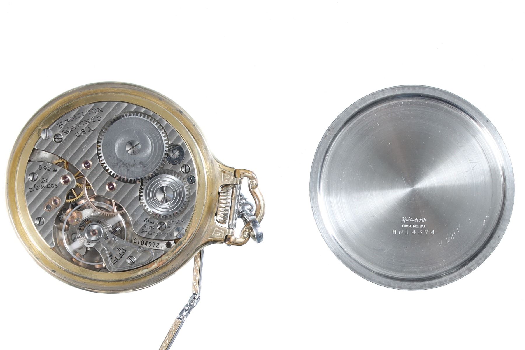Hamilton 992 Two Tone Montgomery Dial Railway Special pocket watch with chain/bag. Inside of lid marked Wadsworth Basemetal H814374. Excellent overall condition with no mars to glass, minimal surface scratches present. Watch runs without issue.