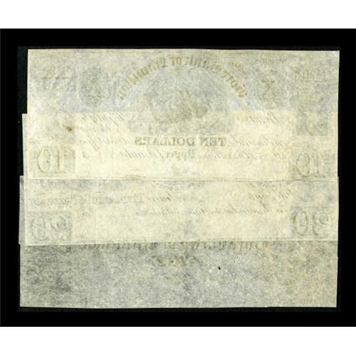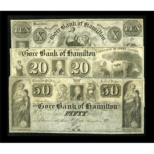 <B>Hamilton, UC- The Gore Bank of Hamilton</B></I> $10, $20, $50 Ch. # 325-10-02R, 325-10-04R, 325-10-06R<BR> Three circa 1837 remainders from this spurious bank, evidently created to trade on the name of the recognized Gore Bank of Hamilton. Each of these poorly executed notes is a high grade specimen, with all three pieces <B>About Uncirculated</B></I> or better. <BR><I>From The Thomas M. Flynn Collection</B></I><BR><BR><b>Shipping:</b> Coins & Currency (<a target="_blank" href="http://www.heritageauctions.com/common/shipping.php">view shipping information</a>)